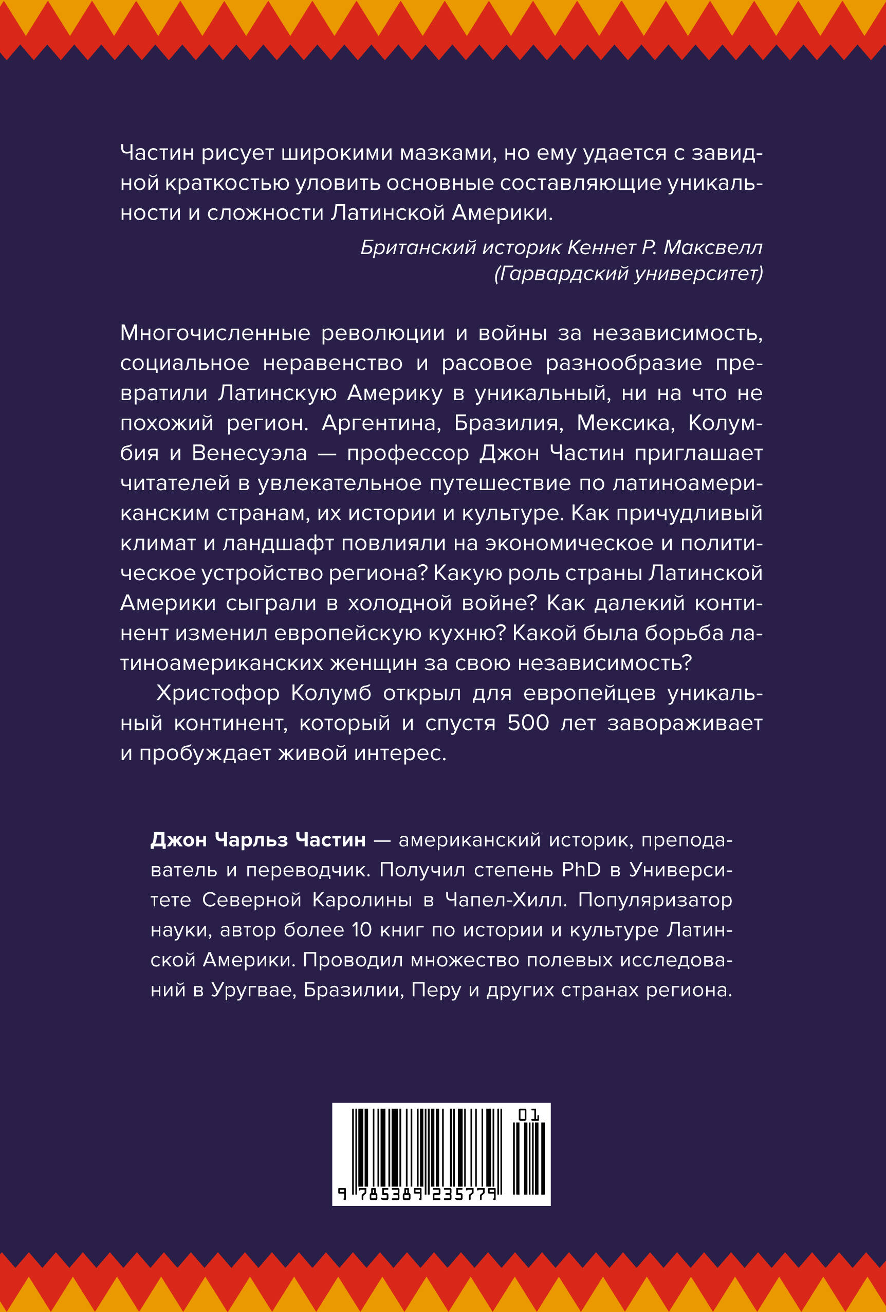 Латиноамериканский континент объединяет двадцать стран и 9 % жителей Земли, культуру цивилизации майя и наследие европейской колонизации. Нередко оставаясь в тени Европы, Латинская Америка тем не менее может похвастаться своими героями: освободитель Симон Боливар, революционер Че Гевара, знаменитая художница Фрида Кало и многие другие. Американский исследователь Джон Частин знакомит нас с бурной историей уникального континента, от первых кораблей европейцев до современных политических интриг. Переплетая социальную, культурную и экологическую историю, Частин создает яркий портрет Латинской Америки с ее тропическими лесами и фавелами, Амазонкой и Андами, карнавалами и Днем мертвых. Из книги вы узнаете, что случилось с цивилизациями ацтеков и инков, как на континенте сформировалось рабство и с какими вызовами сталкиваются современные латиноамериканские страны. Джон Частин открывает нам мир Латинской Америки с его противоречиями и самобытным колоритом. "Чтобы понять Латинскую Америку, нужно понять ее историю. Вот о чем вся эта книга" (Джон Частин). Данная книга выходит на русском языке в двух сериях под названиями "Хроники кипящей крови: Краткая история Латинской Америки" (серия "Исторический интерес") и "Краткая история Латинской Америки" (серия "Города и люди").| Издательство | Азбука-Аттикус Издат.группа ООО |