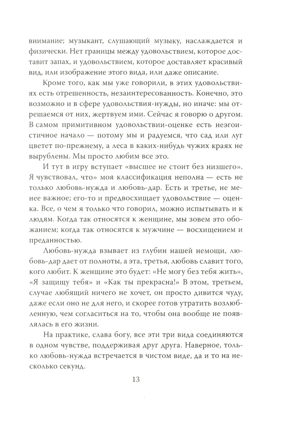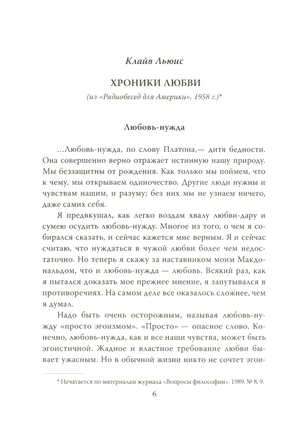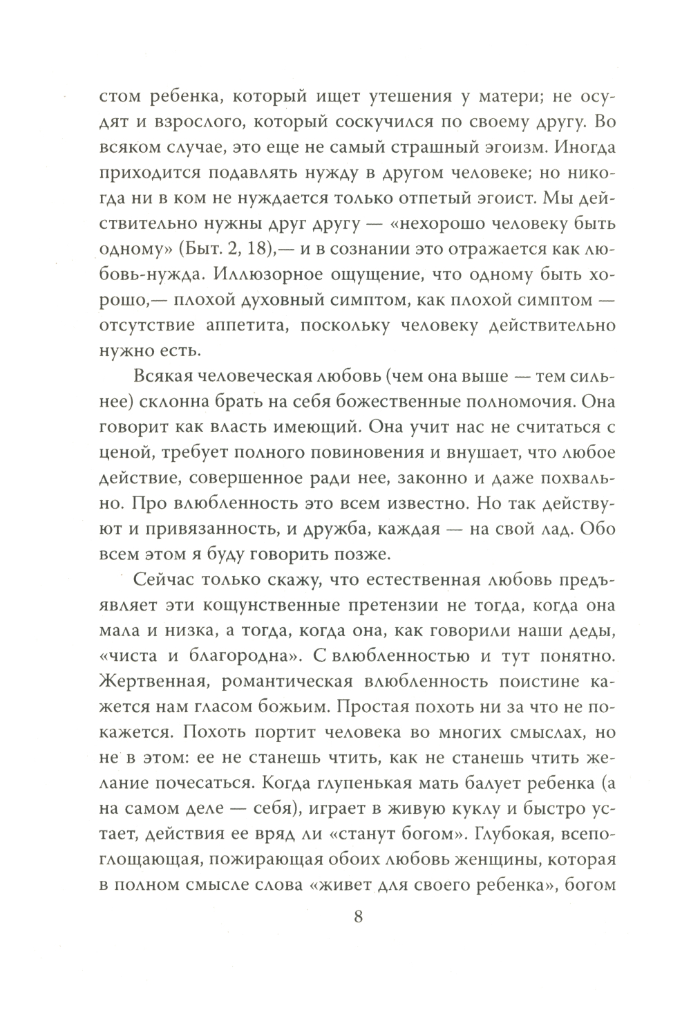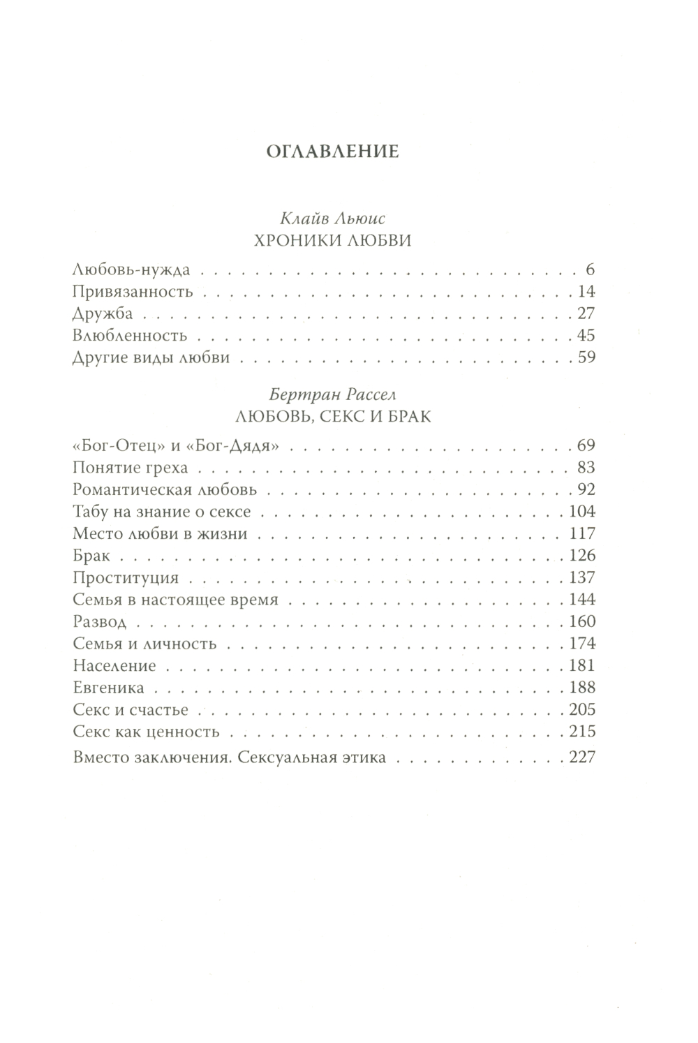 «Мы беззащитны от рождения, нужны друг другу, и в сознании это отражается как любовь, - писал К. Льюис. - Но всякая любовь говорит как власть имеющий. Она учит нас не считаться с ценой, требует полного повиновения и внушает, что любое действие, совершенное ради нее, законно и даже похвально». Как известно, греки различали четыре вида любви: от «агапэ» (жертвенной, бескорыстной) до «эроса» (чувственной, плотской). Клайв Льюис (1898-1963) британский писатель (автор «Хроник Нарнии») и философ, осмысливает эти виды и дает им собственное толкование. Другой английский мыслитель - Бертран Рассел (1872-1970), философ, математик и общественный деятель, лауреат Нобелевской премии, останавливается более подробно на видах любовного влечения и связанных с ними отношениях, в том числе брачных. Отдельная тема его исследований - место секса в формировании характера и жизни человека, а также соответствующая сексуальная этика.| Издательство | Родина |