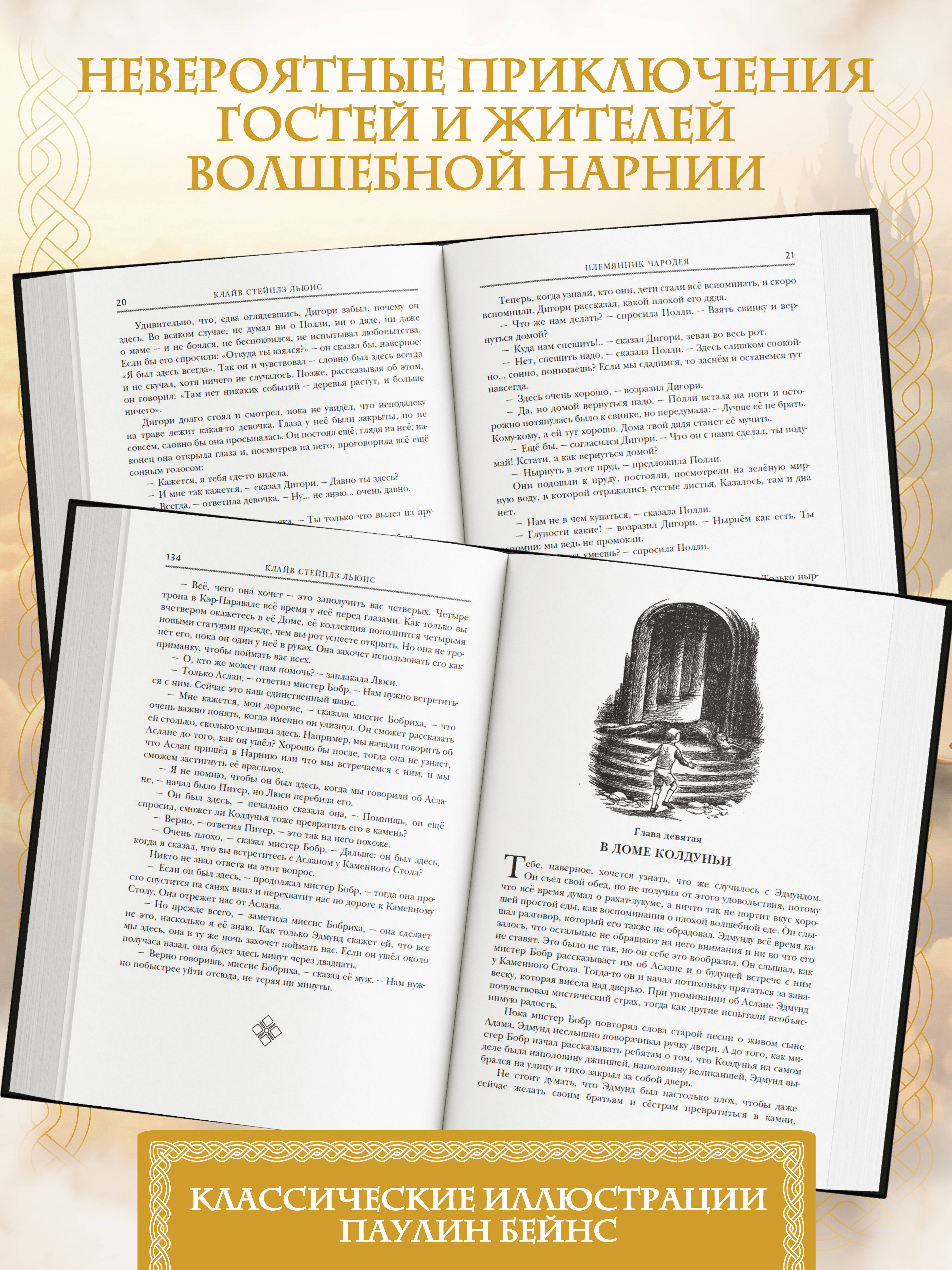 Издание в твёрдом переплёте с тиснением фольгой и частичным лаком. Плотная белая бумага. Чёткий, удобный для чтения шрифт. Классические чёрно-белые иллюстрации Паулин Бейнс. В книгу вошли все семь повестей всемирно известного цикла К. С. Льюиса «Хроники Нарнии» - о волшебной стране, в которой добро всегда торжествует. Много столетий назад великий лев Аслан создал Нарнию - чудесный мир, населённый диковинными существами, говорящими животными и танцующими деревьями. Четверо ребят из обычной семьи даже представить не могли, что дверь в волшебную страну скрывается в старом платяном шкафу, стоящем в пустой комнате. Но, шагнув однажды в пределы Нарнии, они уже не расстанутся с ней. А затем удивительный мир откроется и их друзьям - ведь «каждый находит то, что ищет на самом деле». «Придёт день, - пишет К. С. Льюис, - когда ты повзрослеешь настолько, чтобы снова начать читать сказки». И это действительно так. Знакомство с Нарнией очаровывает детей и возвращает взрослым веру в чудеса. Общий тираж «Хроник Нарнии» превышает 100 миллионов экземпляров. Повесть «Лев, колдунья и платяной шкаф» вошла в список «100 великих романов на английском языке» (по версии журнала «Тайм»), а «Последняя битва» удостоена медали Карнеги - самой престижной британской награды за детскую книгу. К сюжетам волшебных повестей постоянно обращаются режиссёры и продюсеры, привлекая миллионы зрителей во всём мире.| Издательство | ООО "Издательство "Эксмо" |