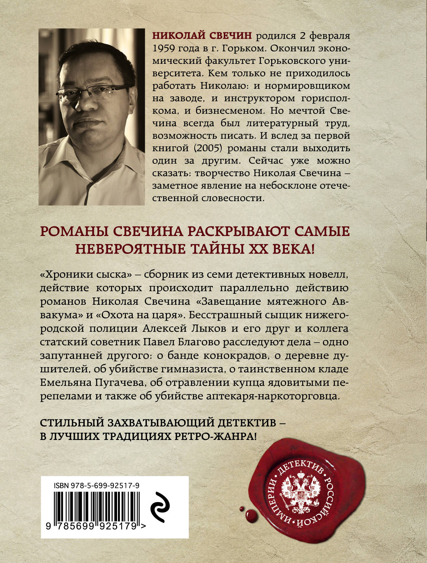 Стильная серия модного автора ретро-детективов Николая Свечина. Журнал «Афиша» назвал Свечина надеждой русского детектива! Яркая альтернатива Б. Акунину. Книга станет подарком для всех ценителей остросюжетного жанра! Николай Свечин - один из самых известных авторов исторических детективов, номинант премии «Русский детектив» и лидер в своей нише. Самая знаменитая серия Свечина - серия про расследования Алексея Лыкова. Она насчитывает уже более 20 романов и сборников, в каждом из которых - отдельная история преступлений, но узнаваемые герои. Эффект остросюжетного сериала. «Хроники сыска» - сборник из семи детективных новелл, действие которых происходит параллельно действию романов Николая Свечина «Завещание Аввакума» и «Охота на царя». Бесстрашный сыщик нижегородской полиции Алексей Лыков и его друг и коллега статский советник Павел Благово расследуют дела - одно запутанней другого: о банде конокрадов, о деревне душителей, об убийстве гимназиста, о таинственном кладе Емельяна Пугачева, об отравлении купца ядовитыми перепелами, а также об убийстве аптекаря-наркоторговца. Стильный захватывающий детектив - в лучших традициях ретро-жанра! Удобное легкое издание малого формата, которое не претендует на место в вашем доме и не захламит книжную полку, но может быть прочитано и передано другому.| Издательство | ООО "Издательство "Эксмо" |