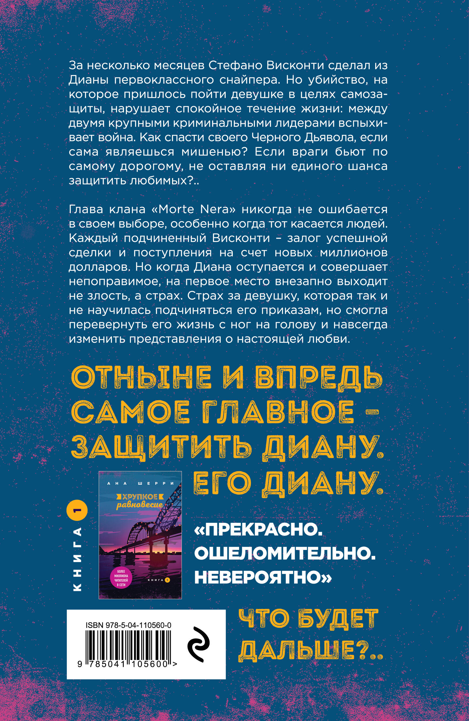 Книга в картонной упаковке. Вторая часть знаменитой трилогии «Хрупкое равновесие» от автора бестселлеров «Я подарю тебе крылья» и «Одно небо на двоих» Аны Шерри. За несколько месяцев Стефано Висконти сделал из Дианы первоклассного снайпера. Но убийство, на которое пришлось пойти девушке в целях самозащиты, нарушает спокойное течение жизни: между двумя крупными криминальными лидерами вспыхивает война. Как спасти своего Черного Дьявола, если сама являешься мишенью? Если враги бьют по самому дорогому, не оставляя ни единого шанса защитить любимых?.. Глава клана «Morte Nera» никогда не ошибается в своем выборе, особенно когда тот касается людей. Каждый подчиненный Висконти - залог успешной сделки и поступления на счет новых миллионов. Но когда Диана оступается и совершает непоправимое, на первое место внезапно выходит не злость, а страх. Страх за девушку, которая так и не научилась подчиняться его приказам, но смогла перевернуть его жизнь с ног на голову и навсегда изменить представления о настоящей любви. Отныне и впредь самое главное - защитить Диану. Его Диану. Калифорния, война между двумя крупнейшими мафиозными кланами на побережье, перестрелки, продажа оружия и… любовь. Которой нет места в мире, где все покупается и продается.| Издательство | ООО "Издательство "Эксмо" |