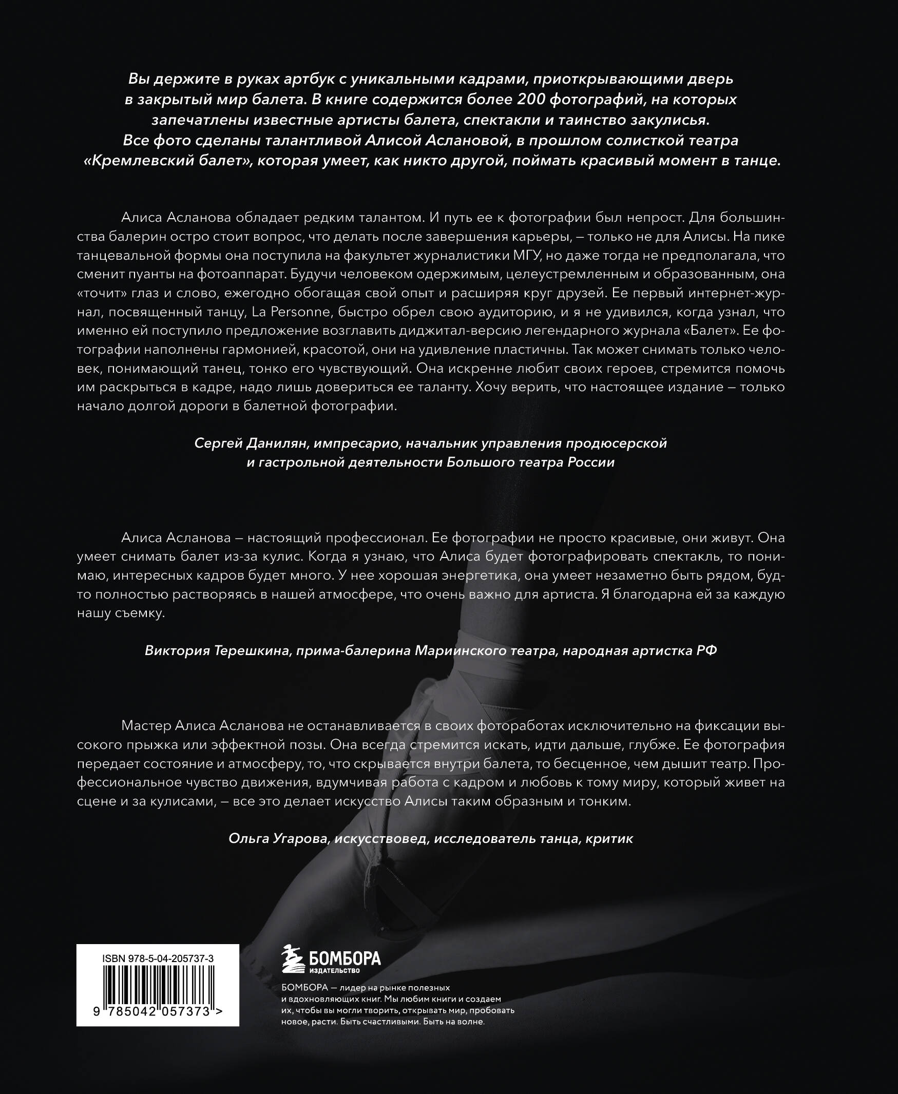 Книга, с которой можно открыть таинственный и недоступный мир закулисья и балетной фотографии. Настоящий кладезь уникальных авторских снимков, сделанных талантливой Алисой Аслановой, которая не только проведёт читателя за кулисы, но и расскажет о своём творческом пути, поиске себя и поделится опытом в создании такого сложного вида фотографии, как балетная. Каждое фото - это настоящее произведение искусства, отражающее всю красоту и хрупкость момента. "Мастер Алиса Асланова не останавливается в своих фотоработах исключительно на фиксации высокого прыжка или эффектной позы. Она всегда стремится искать, идти дальше, глубже. Ее фотография передает состояние и атмосферу, то, что скрывается внутри балета, то бесценное, чем дышит театр. Профессиональное чувство движения и артиста, вдумчивая работа с кадром и любовь к тому миру, который живет на сцене и за кулисами - все это делает искусство Алисы таким образным и тонким" Ольга Угарова (Искусствовед, исследователь танца, критик) На обложке: Светлана Захарова, народная артистка РФ "Лебедь", 2024| Издательство | ООО "Издательство "Эксмо" |