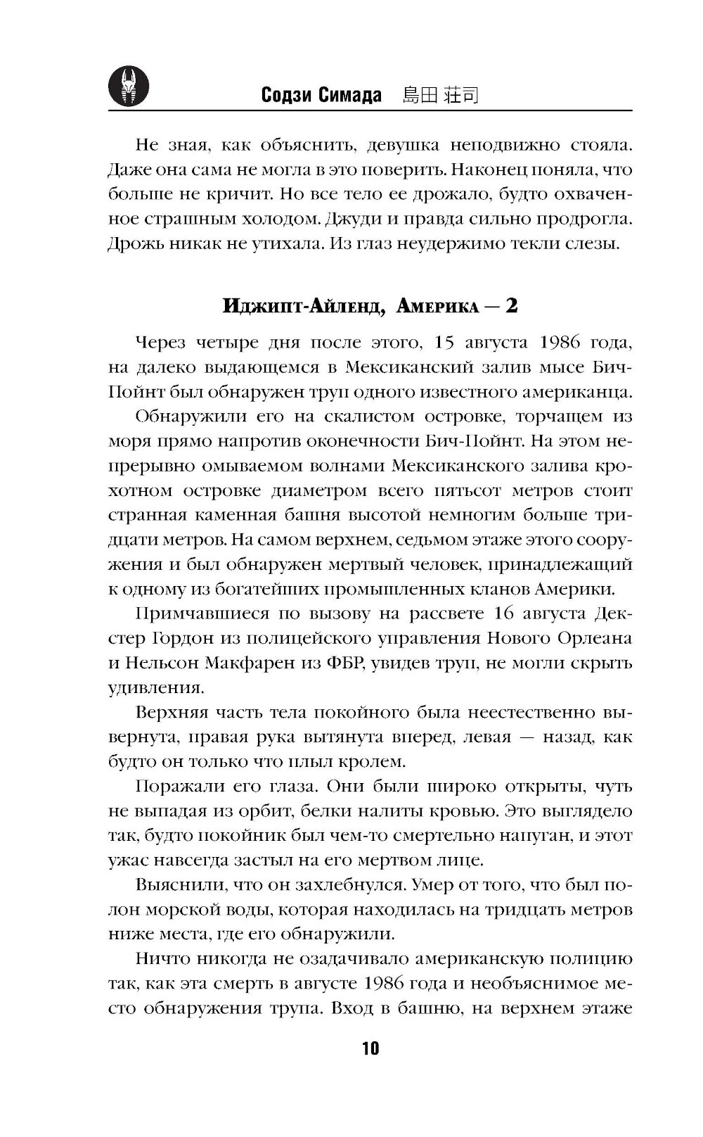 На крохотном островке у самого побережья Луизианы стоит странная 30-метровая каменная башня. На седьмом, самом верхнем ее этаже 15 августа 1986 года обнаружили мертвым очень известного человека, члена богатейшего клана Америки. Он... захлебнулся морской водой. Едва не выпавшие из орбит глаза свидетельствовали: в момент смерти покойник испытал жуткий испуг. А тело осталось в такой позе, будто он изо всех сил плыл кролем. Вход в башню закрывала массивная, плотно прилегающая сейфовая дверь, запертая изнутри. Иным путем в глухое строение попасть никто не смог бы. Кроме того, несколько человек с утра до вечера непрерывно наблюдали за башней и окрестностями и не заметили ровным счетом ничего подозрительного. Да, и погода была ясная. В Америке нет никого, кто смог бы разгадать тайну этой невозможной, сверхъестественной смерти. Но на другой стороне Тихого океана живет гениальный сыщик Киёси Митараи, способный найти разгадку за несколько дней...| Издательство | Эксмо |