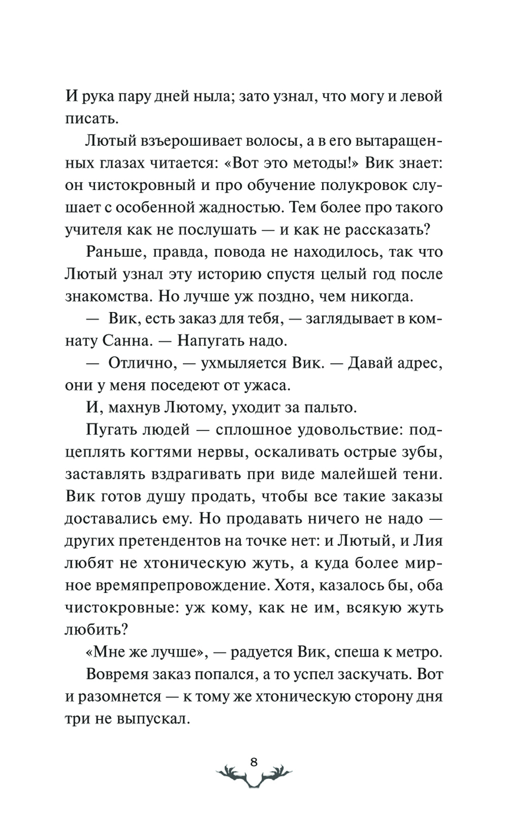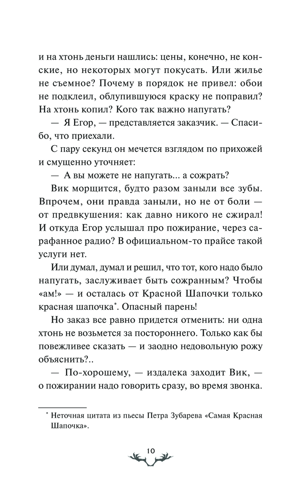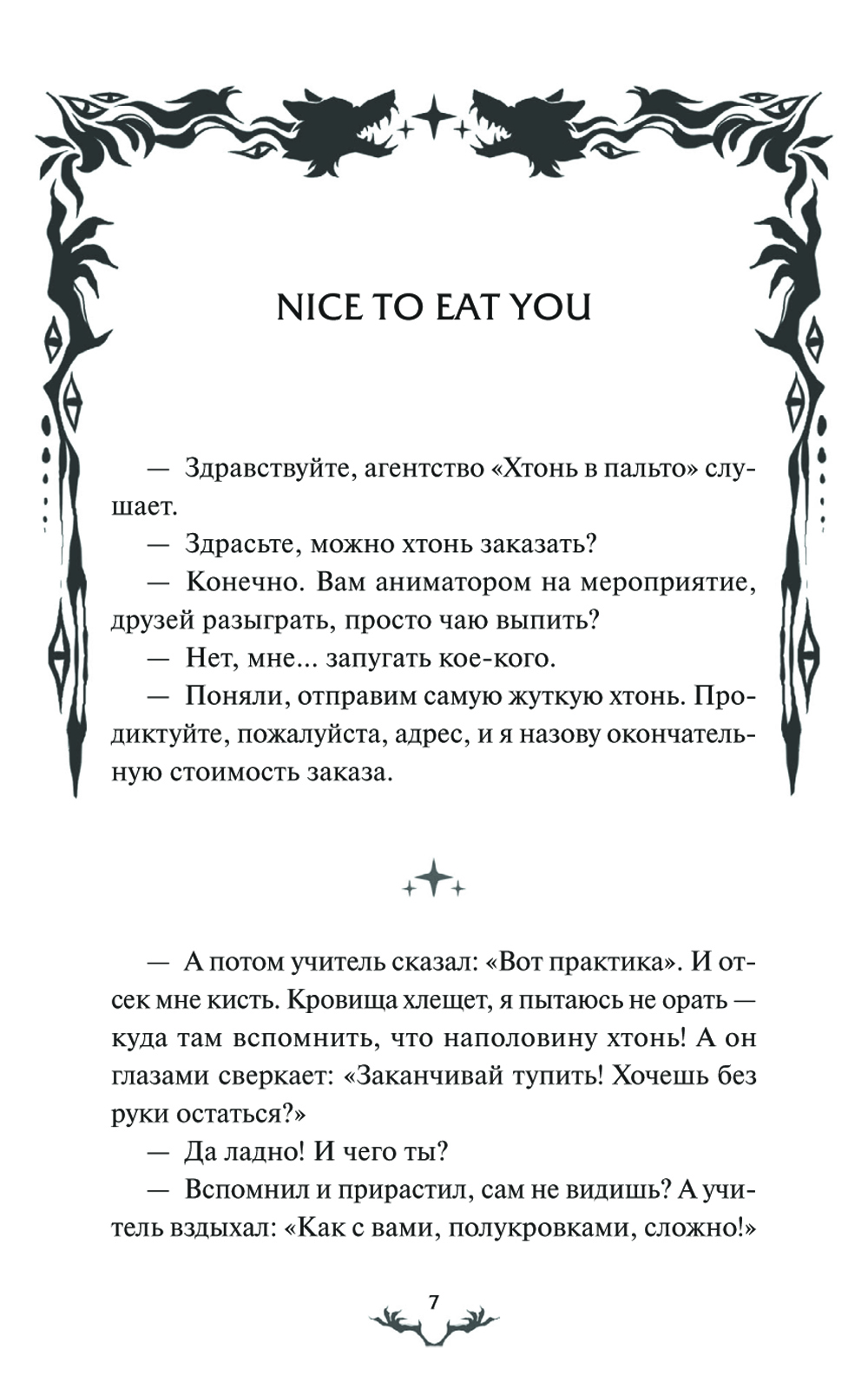 В любом городе, помимо людей, живут хтонические существа. Они скрывают чудовищный облик под маской человеческого, общаются с мелкими духами, ловят когтями чужие эмоции - и работают в агентстве «Хтонь в пальто». Хотите напугать друзей на вечеринке? Требуется няня для ершистого подростка? Не с кем выпить чаю? Вы обратились по адресу! Когда девушка-бариста находит в кофейне визитку агентства, перед ней особенно остро встает выбор, преследующий всю жизнь: продолжить притворяться, что у мира есть только человеческая сторона, или наконец признать, что хтони существуют?