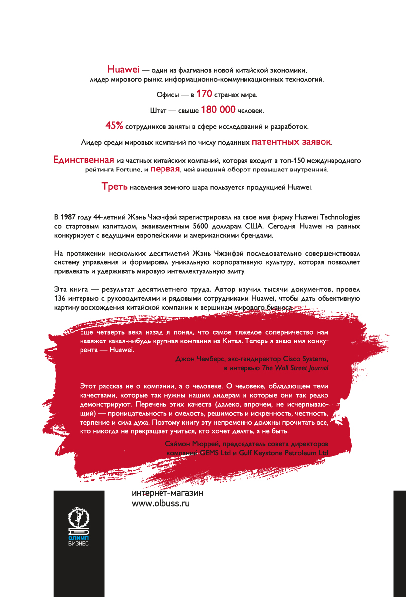 Huawei - один из флагманов новой китайской экономики. Почти за тридцать лет своего существования компания превратилась из мелкого продавца АТС в ведущего разработчика инновационных решений в сфере информационно-коммуникационных технологий. Офисы компании открыты в 170 странах мира, а ее продукцией пользуется треть населения земного шара. Сегодня Huawei - единственная из частных китайских компаний, которая входит в топ-150 международного рейтинга Fortune. Поразительный успех Huawei основан на трех ценностях: центральной роли клиента, самоотдаче сотрудников и их преданности делу. Со временем в компании сложился уникальный стиль управления, сочетающий в себе особенности восточной и западной моделей. А главное, с первого дня существования Huawei ее основатель Жэнь Чжэнфэй строил компанию, ориентированную на перспективу, в которой каждый нацелен на результат. Эта книга - итог более чем десятилетнего тщательного исследования. Автор изучил тысячи страниц документов, провел 136 интервью с руководителями и рядовыми сотрудниками Huawei, чтобы дать объективную картину восхождения китайской компании к вершинам мирового бизнеса.| Издательство | Олимп-Бизнес |