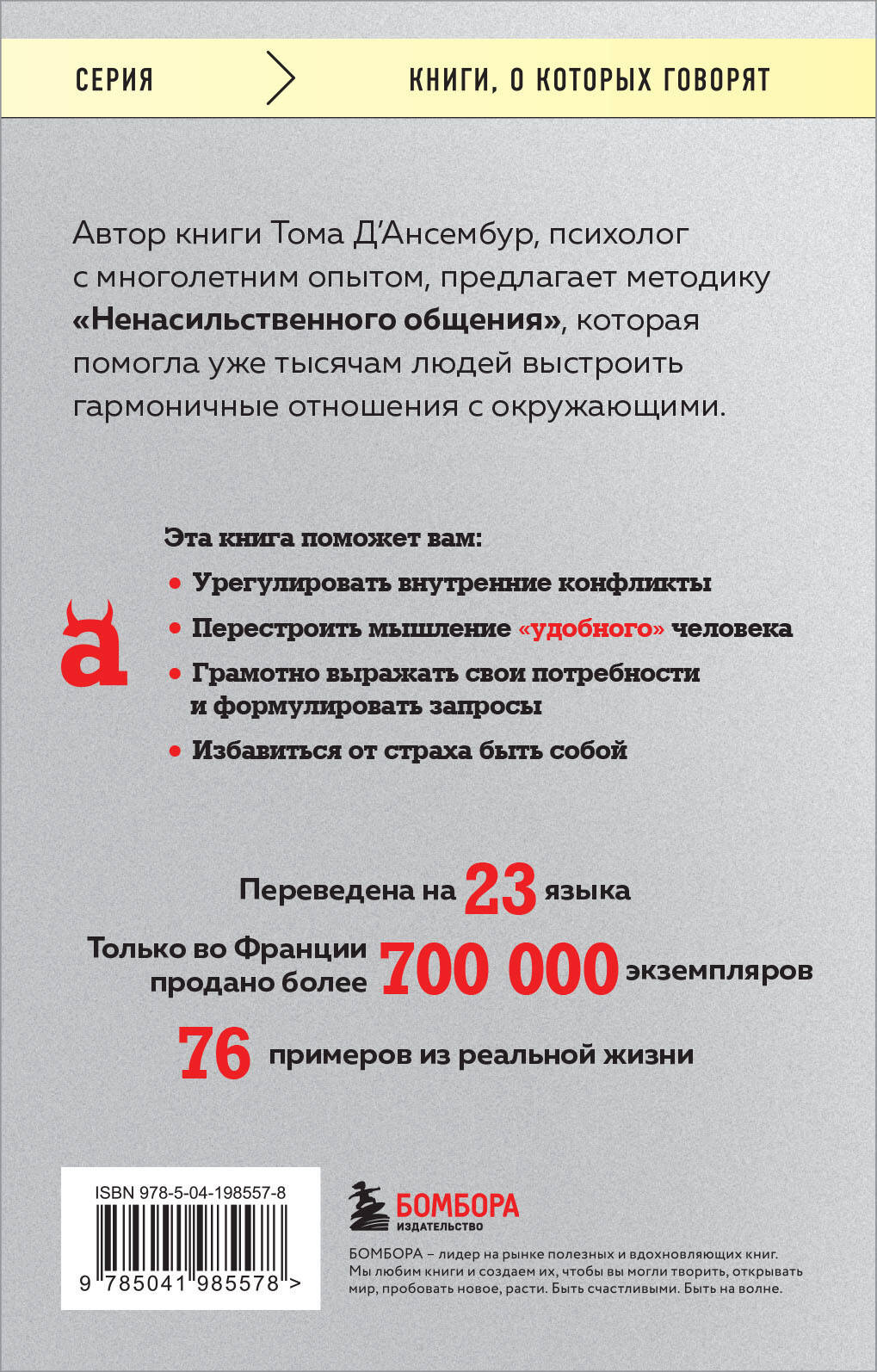 Переиздание бестселлера саморазвития в популярной серии «Книги, о которых говорят»! Все беды от того, что мы так и норовим перекроить себя под ожидания окружающих, считает автор этой книги Тома Д'Ансембур. Делаем не то, что хотим, а то, что, как нам кажется, хотят от нас другие. Отсюда обиды, конфликты, недовольство собственной жизнью и отношением к себе других людей. Как быть? Применять принципы «Ненасильственного общения» - системы, которая помогает разобраться со своими настоящими желаниями и учит правильно формулировать запросы к окружающим. Применяйте принципы ННО: - не изнуряйте себя даже ради доброго дела; - наблюдайте, не вынося суждений; - говорите по-настоящему, слушайте по-настоящему; - не приписывайте свои потребности другим; - формулируйте конкретный и реализуемый запрос.| Издательство | ООО "Издательство "Эксмо" |