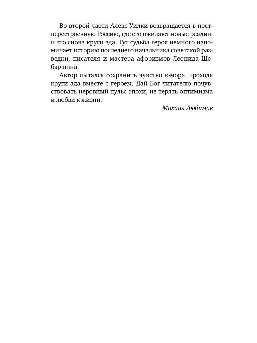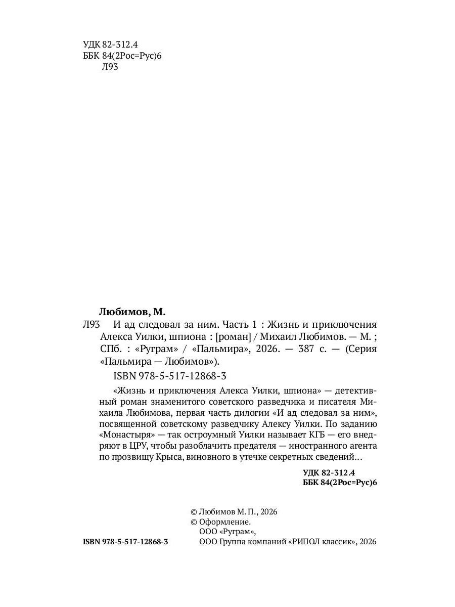 «Жизнь и приключения Алекса Уилки, шпиона» - детективный роман знаменитого советского разведчика и писателя Михаила Любимова, первая часть дилогии «И ад следовал за ним», посвященной советскому разведчику Алексу Уилки. По заданию «Монастыря» - так остроумный Уилки называет КГБ - его внедряют в ЦРУ, чтобы разоблачить предателя - иностранного агента по прозвищу Крыса, виновного в утечке секретных сведений…| Издательство | Т8 RUGRAM |