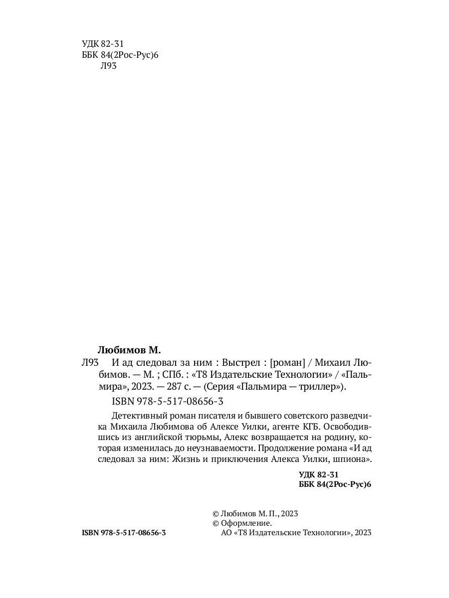 "Выстрел" - детективный роман о жизни и захватывающих приключениях Алекса Уилки, агента КГБ. Проведя в английской тюрьме несколько лет, во время перестройки разведчик оказывается на свободе и возвращается в Москву, где опасность подстерегает на каждом шагу.