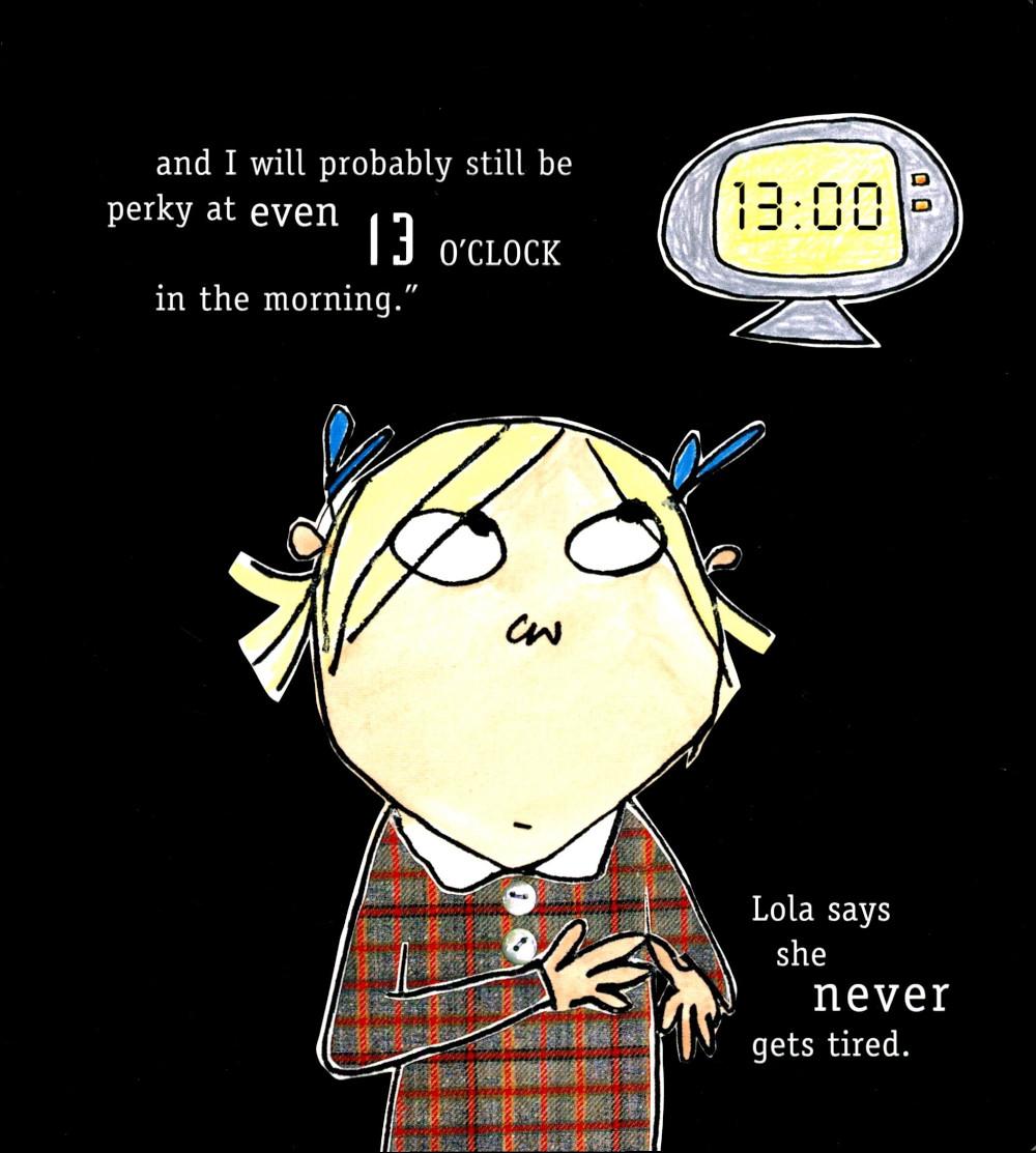 Charlie has this little sister Lola. Sometimes he has to try and get her to go to bed. This is a hard job because Lola likes to stay up late. Lola says, «I am not slightly sleepy at 6 or 7 or 8. I am still wide awake at 9 and not at all tired at 10, 11 and 12 and I will probably still be perky even at 13 o'clock in the morning.» Lola says she never gets tired.| Издательство | Orchard Book |