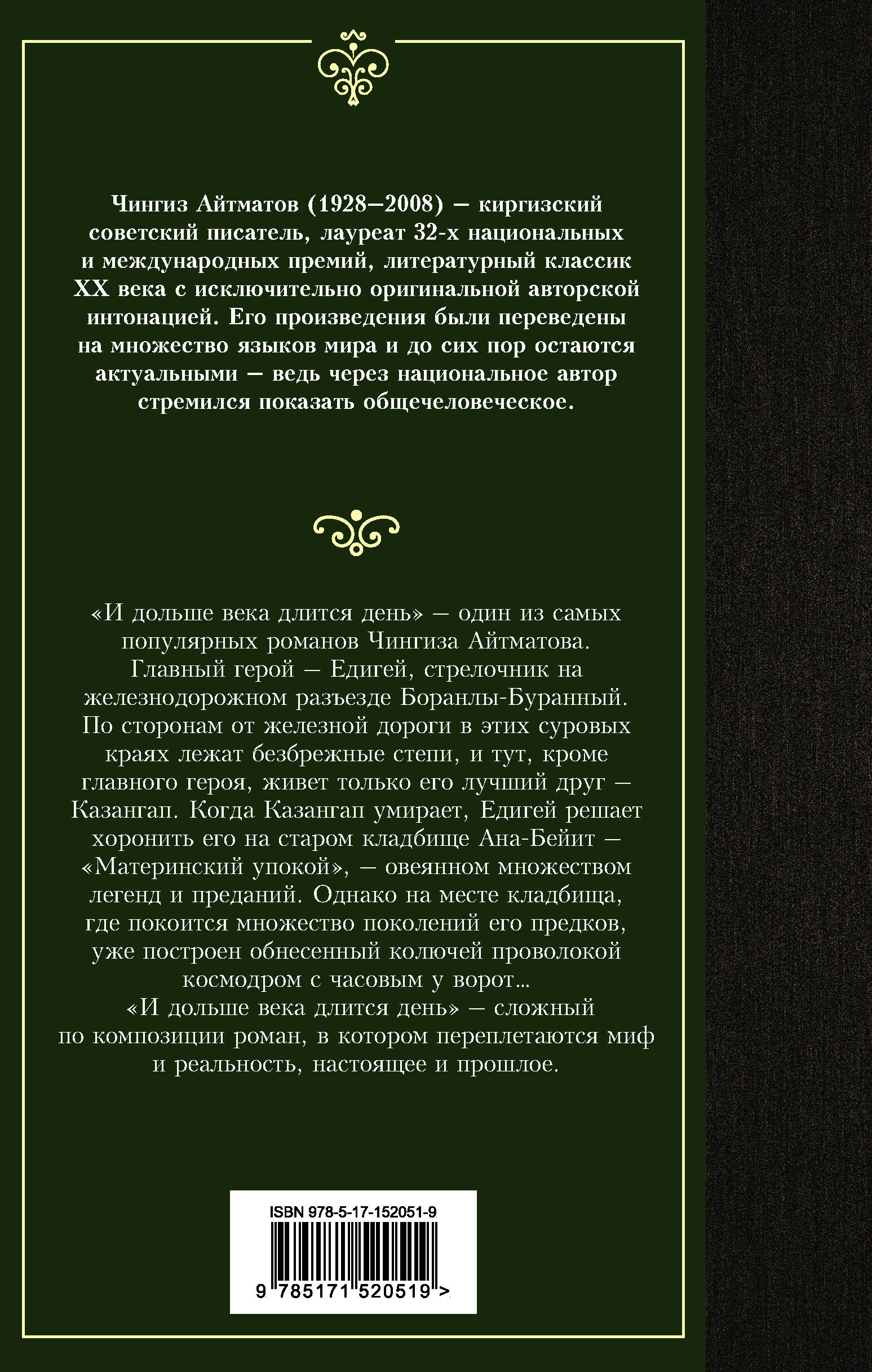 "И дольше века длится день" - один из самых популярных романов Чингиза Айтматова. Главный герой - Едигей, стрелочник на железнодорожном разъезде Боранлы-Буранный. По сторонам от железной дороги в этих суровых краях лежат безбрежные степи, и тут, кроме главного героя, живет только его лучший друг - Казангап. Когда Казангап умирает, Едигей решает хоронить его на старом кладбище Ана-Бейит - "Материнский упокой", - овеянном множеством легенд и преданий. Однако на месте кладбища, где покоится множество поколений его предков, уже построен обнесенный колючей проволокой космодром с часовым у ворот… "И дольше века длится день" - сложный по композиции роман, в котором переплетаются миф и реальность, настоящее и прошлое.