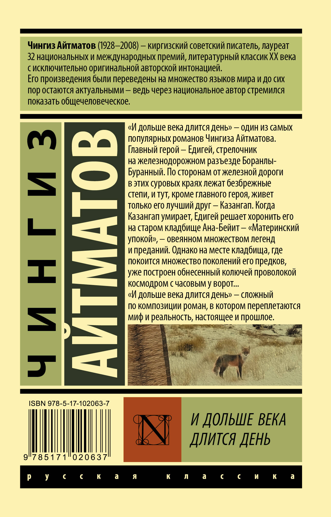 "И дольше века длится день" - один из самых популярных романов Чингиза Айтматова. Главный герой - Едигей, стрелочник на железнодорожном разъезде Боранлы - Буранный. По сторонам от железной дороги в этих суровых краях лежат безбрежные степи, и тут, кроме главного героя, живет только его лучший друг - Казангап. Когда Казангап умирает, Едигей решает хоронить его на старом кладбище Ана-Бейит - "Материнский упокой", - овеянном множеством легенд и преданий. Однако на месте кладбища, где покоится множество поколений его предков, уже построен обнесенный колючей проволокой космодром с часовым у ворот… "И дольше века длится день" - сложный по композиции роман, в котором переплетаются миф и реальность, настоящее и прошлое.| Издательство | ИЗДАТЕЛЬСТВО "АСТ" |