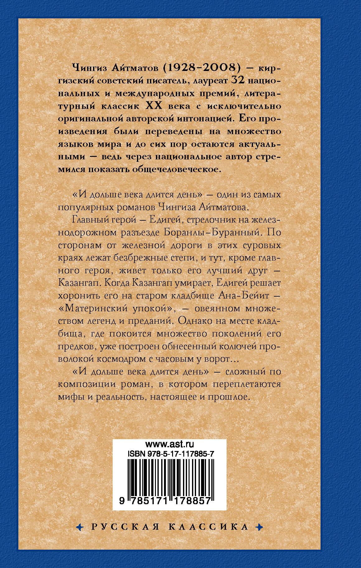 "И дольше века длится день" - один из самых популярных романов Чингиза Айтматова. Главный герой - Едигей, стрелочник на железнодорожном разъезде Боранлы-Буранный. По сторонам от железной дороги в этих суровых краях лежат безбрежные степи, и тут, кроме главного героя, живет только его лучший друг - Казангап. Когда Казангап умирает, Едигей решает хоронить его на старом кладбище Ана-Бейит - "Материнский упокой", - овеянном множеством легенд и преданий. Однако на месте кладбища, где покоится множество поколений его предков, уже построен обнесенный колючей проволокой космодром с часовым у ворот… "И дольше века длится день" - сложный по композиции роман, в котором переплетаются миф и реальность, настоящее и прошлое.| Издательство | Издательство "АСТ" |