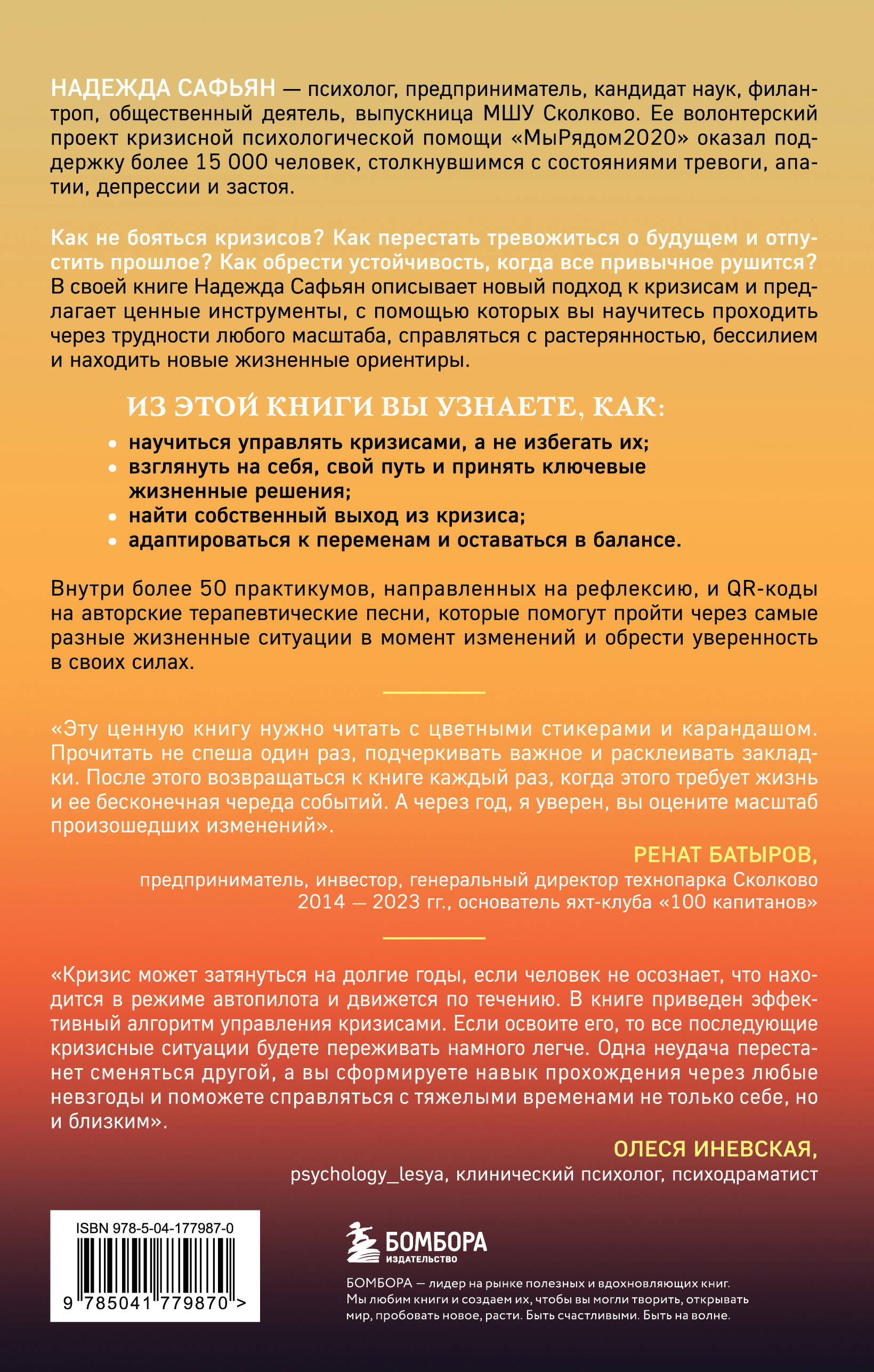 Надежда Сафьян - психолог, предприниматель, кандидат наук, филантроп, общественный деятель, выпускница МШУ Сколково. Ее волонтерский проект кризисной психологической помощи «МыРядом2020» оказал поддержку более 15 000 человек, столкнувшимся с состояниями тревоги, апатии, депрессии и застоя. Как не бояться кризисов? Как перестать тревожится о будущем и отпустить прошлое? Как обрести устойчивость, когда все привычное рушится? В своей книге Надежда Сафьян описывает новый подход к кризисам и предлагает ценные инструменты, с помощью которых вы научитесь проходить через кризисы любого масштаба, справляться с растерянностью, бессилием и находить новые жизненные ориентиры. Из этой книги вы узнаете как: научиться управлять кризисами, а не избегать их; взглянуть на себя, свой путь и принять ключевые жизненные решения; найти собственный выход из кризиса; адаптироваться к жизненным переменам и оставаться в балансе. Внутри более 50 практикумов, направленных на рефлексию, и QR коды на авторские терапевтические песни, которые помогут преодолеть самые разные жизненные ситуации в момент перемен и обрести уверенность в своих силах.| Издательство | ООО "Издательство "Эксмо" |
