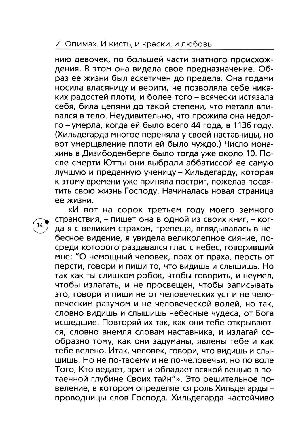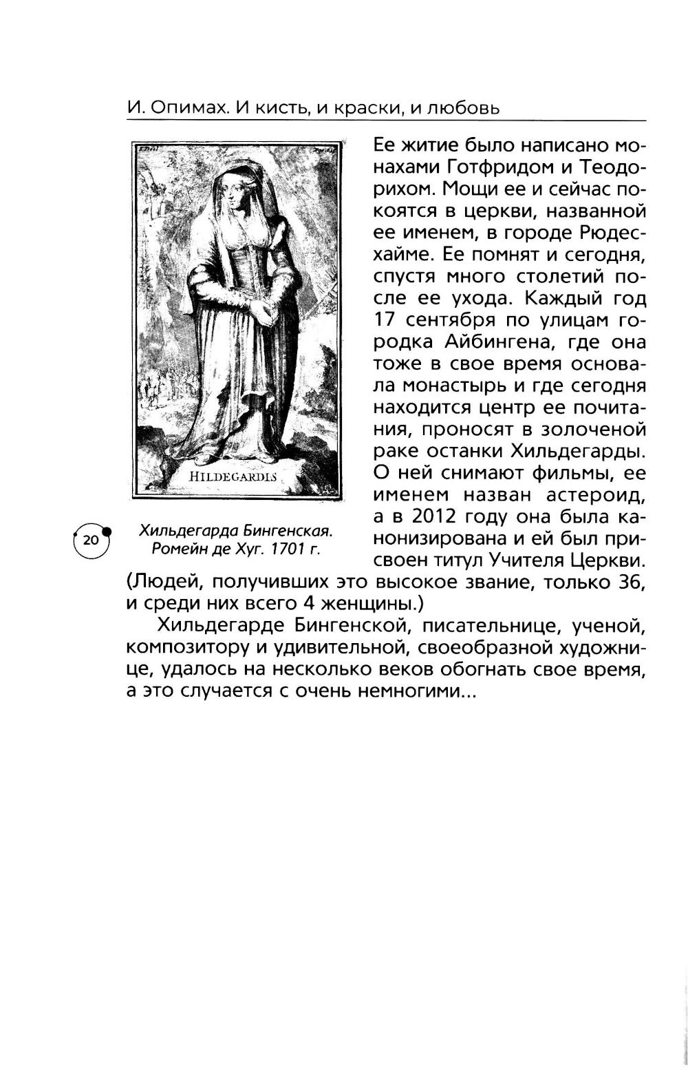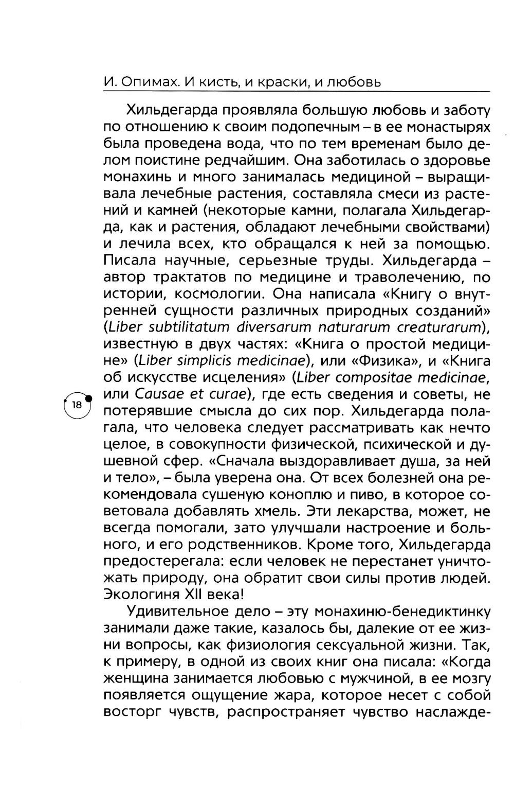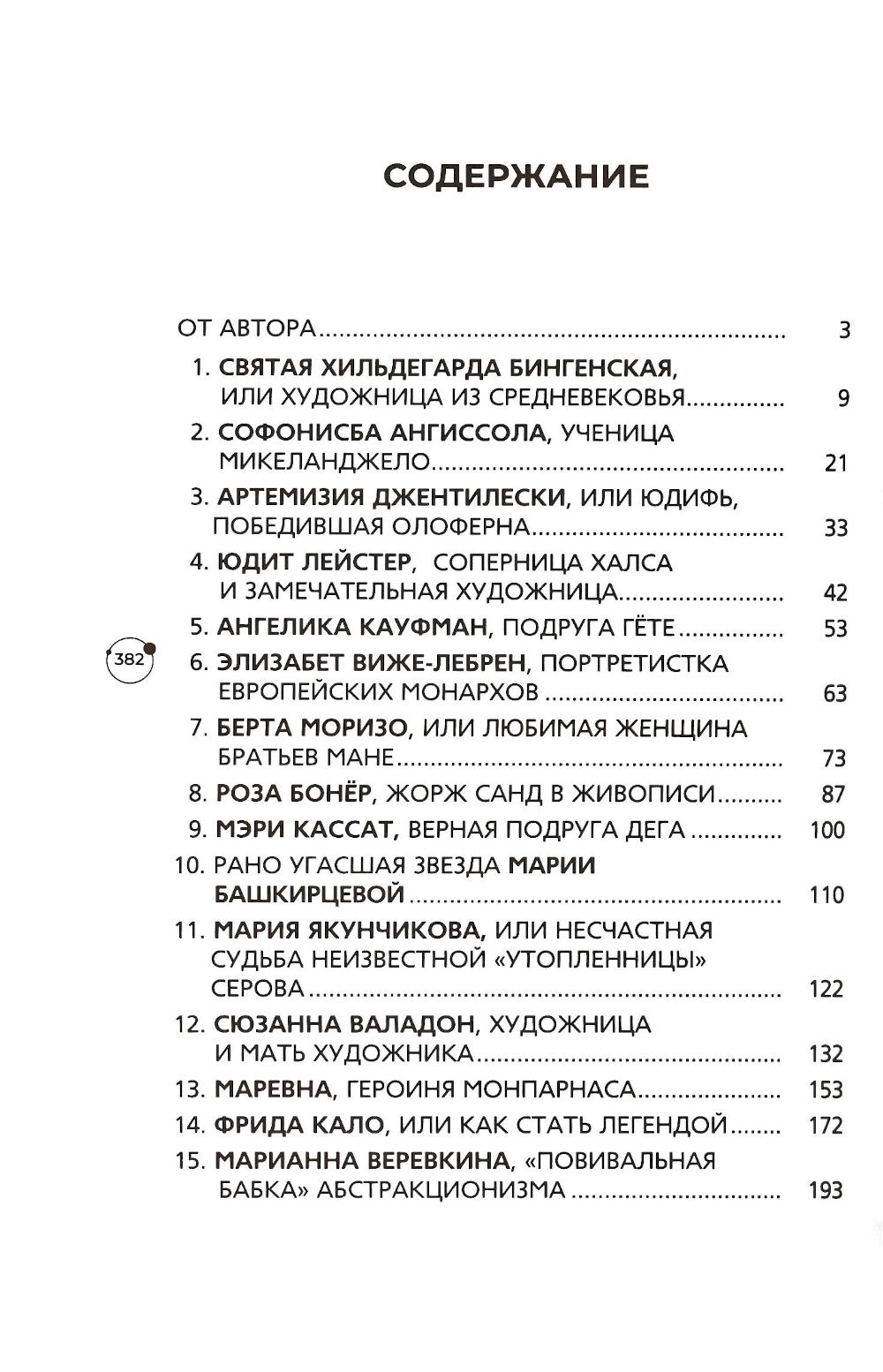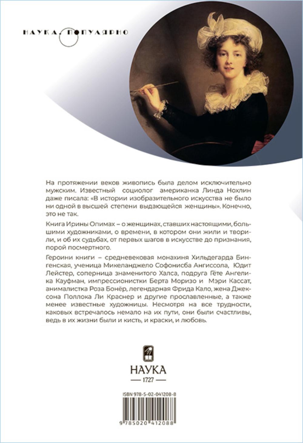 Книга Ирины Опимах, издателя, переводчицы, журналистки - сборник рассказов о художницах, которые, несмотря на социальные барьеры, сопровождающие жизнь женщин во все времена и во всех странах, заняли достойное место в истории искусства. Эти яркие, талантливые дамы доказали, что могут создавать прекрасное не хуже мужчин. Героини книги - средневековая монахиня Хильдегарда Бингенская, ученица Микеланджело Софонисба Ангиссола, подруга Гёте Ангелика Кауфман, импрессионистка Мэри Кассат, анималистка Роза Бонёр, легендарная Фрида Кало, жена Джексона Поллока и сама замечательная художница Ли Краснер, американка Джорджия О'Киф, прославившаяся своими невероятными цветами, и многие другие известные художницы. А объединяет их одно - все они отдали свою жизнь искусству.| Издательство | Наука |