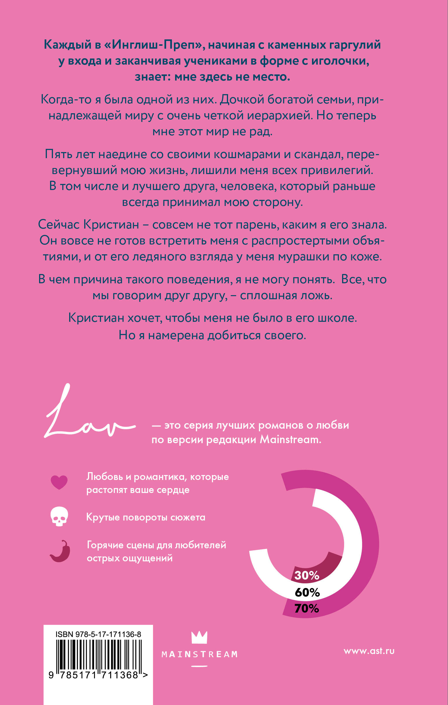 - Драматичный любовный роман в сеттинге закрытой школы для богатых. - Герои с тяжелым прошлым и настоящим. Сюжет, насыщенный событиями и «стеклом». Кинематографичные описания. - Тема школьного буллинга и романтики роднит историю с романом «Все, что я хотела сказать» Моники Мерфи. - Для фанатов творчества Моники Мерфи, Эрин Уатт, Эшли Джейд, Пенелопы Дуглас, Моны Кастен, Мерседес Рон и Рины Кент.| Издательство | Издательство "АСТ" |