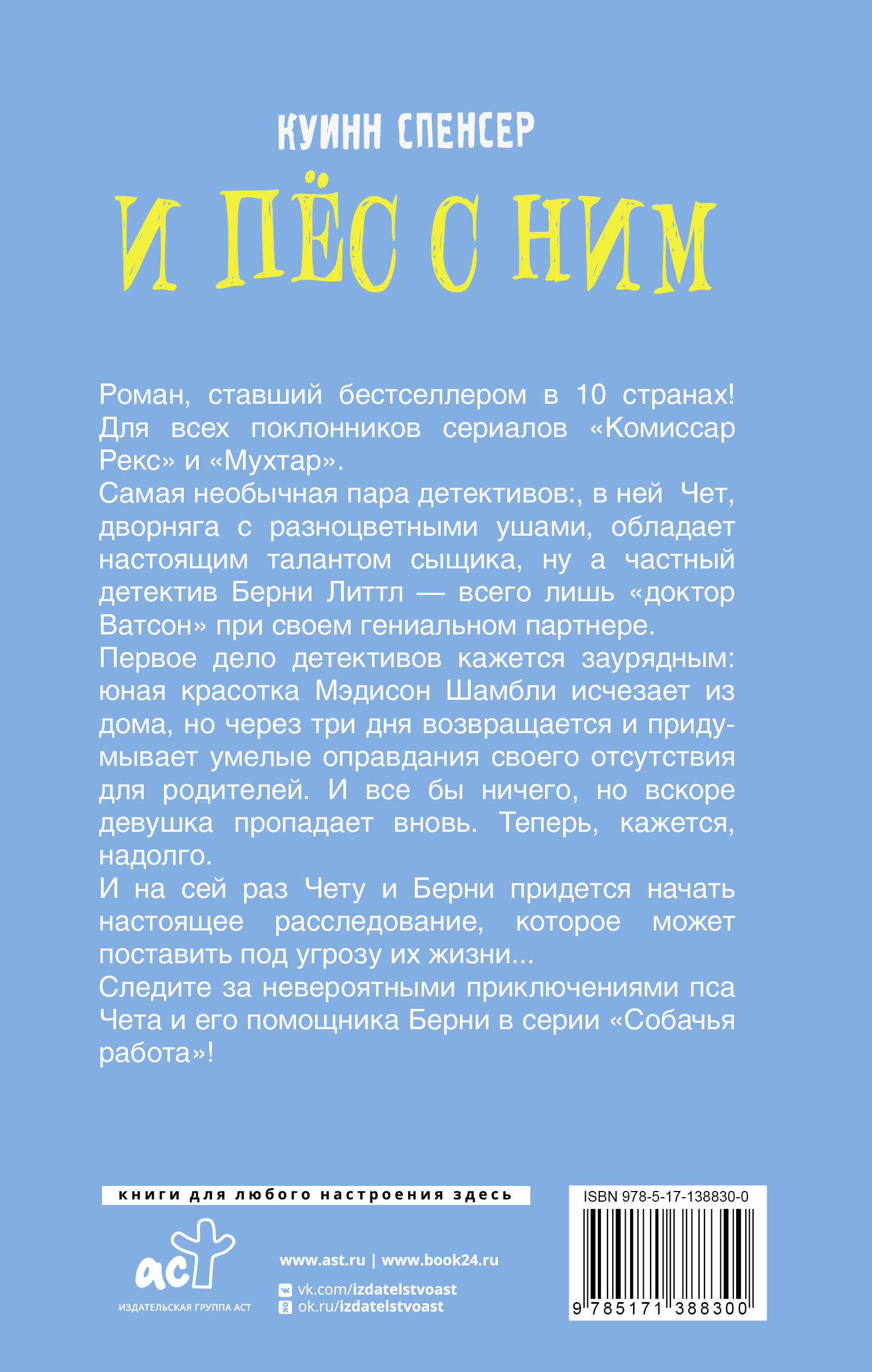 Серия детективов "Собачья работа" для всех поклонников и знаменитого "К-9: Собачья работа" Прекрасное расслабляющее, нетривиальное чтение, остроумная история и настоящий «уютный» детектив. Первая книга серии, роман, ставший бестселлером в 10 странах! Первая книга вышла в 2009 году в Америке и до сих пор пользуется популярностью. Самая необычная пара детективов, в ней - Чет, дворняга с разноцветными ушами, обладает настоящим талантом сыщика, ну а частный детектив Берни Литтл - всего лишь "доктор Ватсон" при своем гениальном партнере. Первое дело детективов кажется заурядным: юная красотка Мэдисон Шамбли исчезает из дома, но через три дня возвращается и придумывает умелые оправдания своего отсутствия для родителей. И все бы ничего, но вскоре девушка пропадает вновь. И на сей раз Чету и Берни придется начать настоящее расследование, которое может поставить под угрозу их жизни... Для всех поклонников сериалов "Комиссар Рекс" и "Мухтар".| Издательство | АСТ |