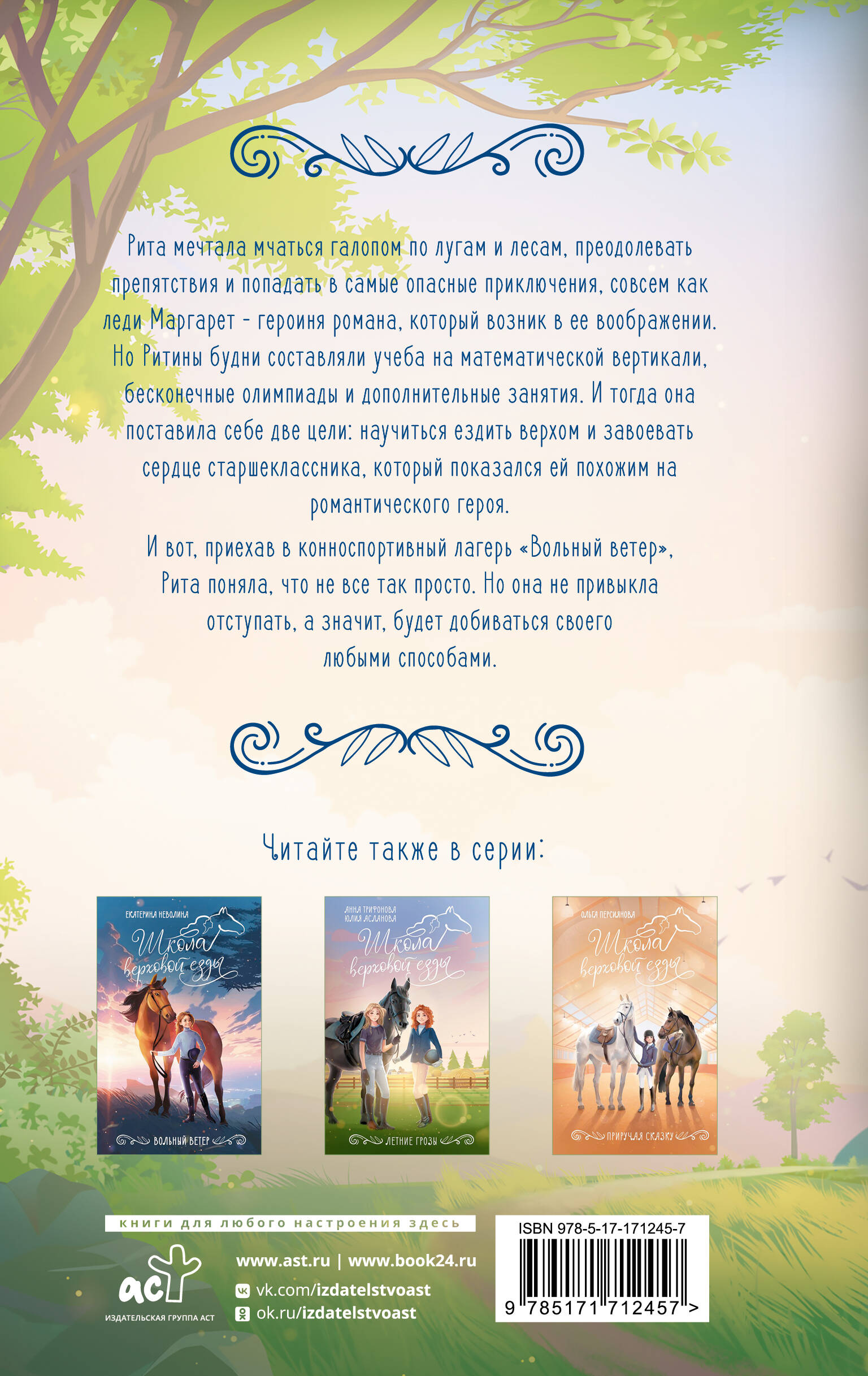 Рита мечтала мчаться галопом по лугам и лесам, преодолевать препятствия и попадать в самые опасные приключения, совсем как леди Маргарет - героиня романа, который возник в ее воображении. Но Ритины будни составляли учеба на математической вертикали, бесконечные олимпиады и дополнительные занятия. И тогда она поставила себе две цели: научиться ездить верхом и завоевать сердце старшеклассника, который показался ей похожим на романтического героя. И вот, приехав в конноспортивный лагерь "Вольный ветер", Рита поняла, что не все так просто. Но она не привыкла отступать, а значит, будет добиваться своего любыми способами.| Издательство | Издательство "АСТ" |