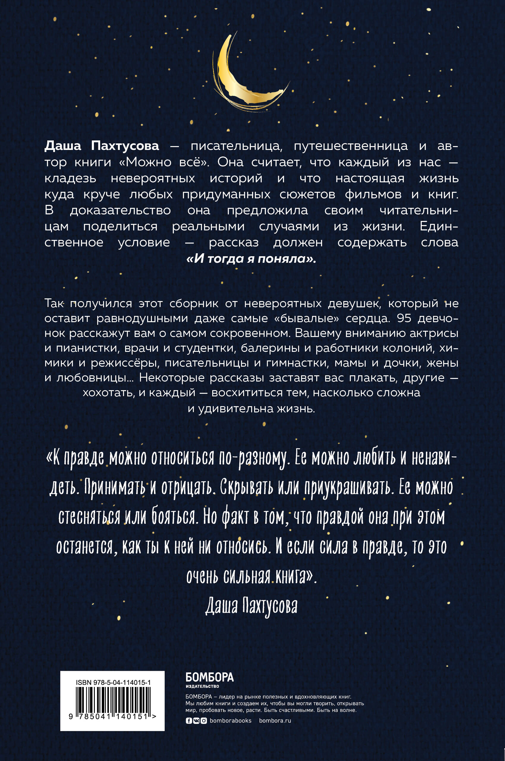 Знаменитая писательница и путешественница Даша Пахтусова уверена - истории каждого из нас гораздо круче и невероятней, чем продуманные сюжеты фильмов и книг. В доказательство она предложила своим читательницам поделиться реальными случаями из жизни. Единственным условием стала фраза "И тогда я поняла". Невероятные истории девушек не оставят равнодушным даже самые "бывалые" сердца. 95 девчонок поделятся своим сокровенным опытом, расскажут о любви и предательстве, жизни и смерти, дружбе и смелости, своей боли и рвению к победе. Эта книга заставит вас убедиться, что жизнь невероятна и многогранна.| Издательство | ООО "Издательство "Эксмо" |