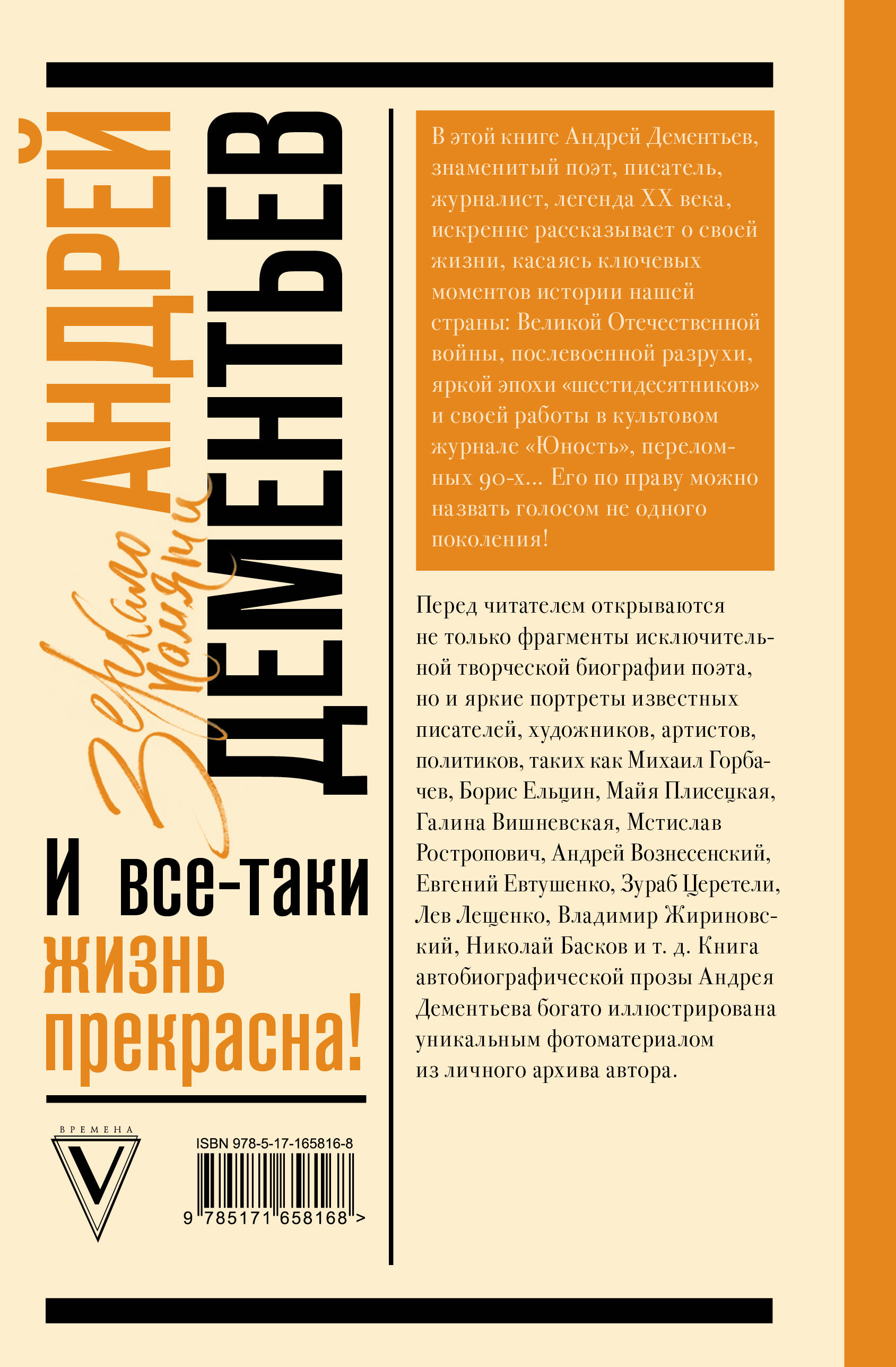 В этой книге Андрей Дементьев, знаменитый поэт, писатель, журналист, легенда XX века искренне рассказывает о своей жизни, касаясь ключевых моментов истории нашей страны: Великой Отечественной войны, послевоенной разрухи, яркой эпохе "шестидесятников" и своей работе в культовом журнале "Юность", переломных 90-ых... Его по праву можно назвать голосом не одного поколения! Перед читателем открываются не только фрагменты исключительной творческой биографии поэта, но и яркие портреты известных писателей, художников, артистов, политиков, таких, как Михаил Горбачев, Борис Ельцин, Майя Плисецкая, Галина Вишневская и Мстислав Ростропович, Андрей Вознесенский, Евгений Евтушенко, Зураб Церетели, Лев Лещенко, Владимир Жириновский, Николай Басков и т. д. Книга автобиографической прозы Андрея Дементьева богато иллюстрирована уникальным фотоматериалом из семейных архивов.| Издательство | Издательство "АСТ" |