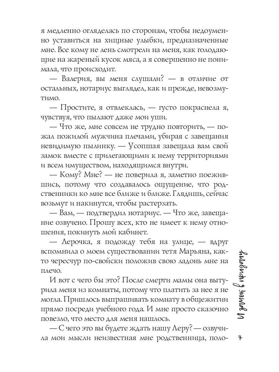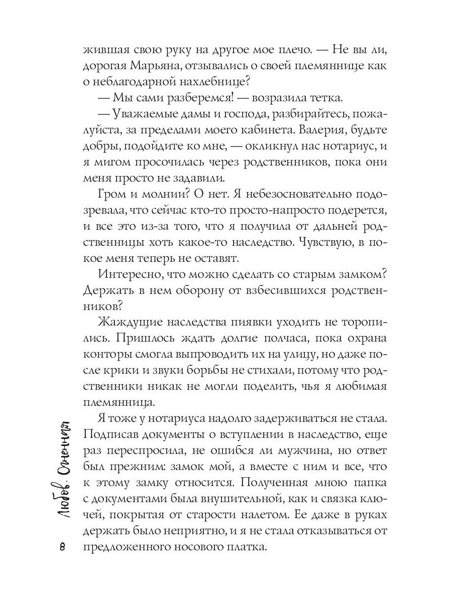 Никогда не думала, что под Новый год мне в наследство может достаться замок. И не просто замок, заросший грязью и пылью, а проклятая резиденция какой-то маркизы, что с полуночи до рассвета живет своей жизнью. Резиденция, где дамы танцуют на балах, а кавалеры жаждут получить не только руку, но и чье-нибудь сердце - иногда даже в буквальном смысле, потому что они - самые настоящие ледяные драконы. Убийства, кражи, дуэли, тайны и интриги. Этот замок кишит загадками, которые теперь я просто обязана разгадать. Кто - я? Разрешите представиться. Валерия Королева - внучка потомственной ведьмы и девушка, к которой вместе с замком в наследство перешло и проклятье. Проклятье, которое запрещает любить.| Издательство | Т8 RUGRAM |