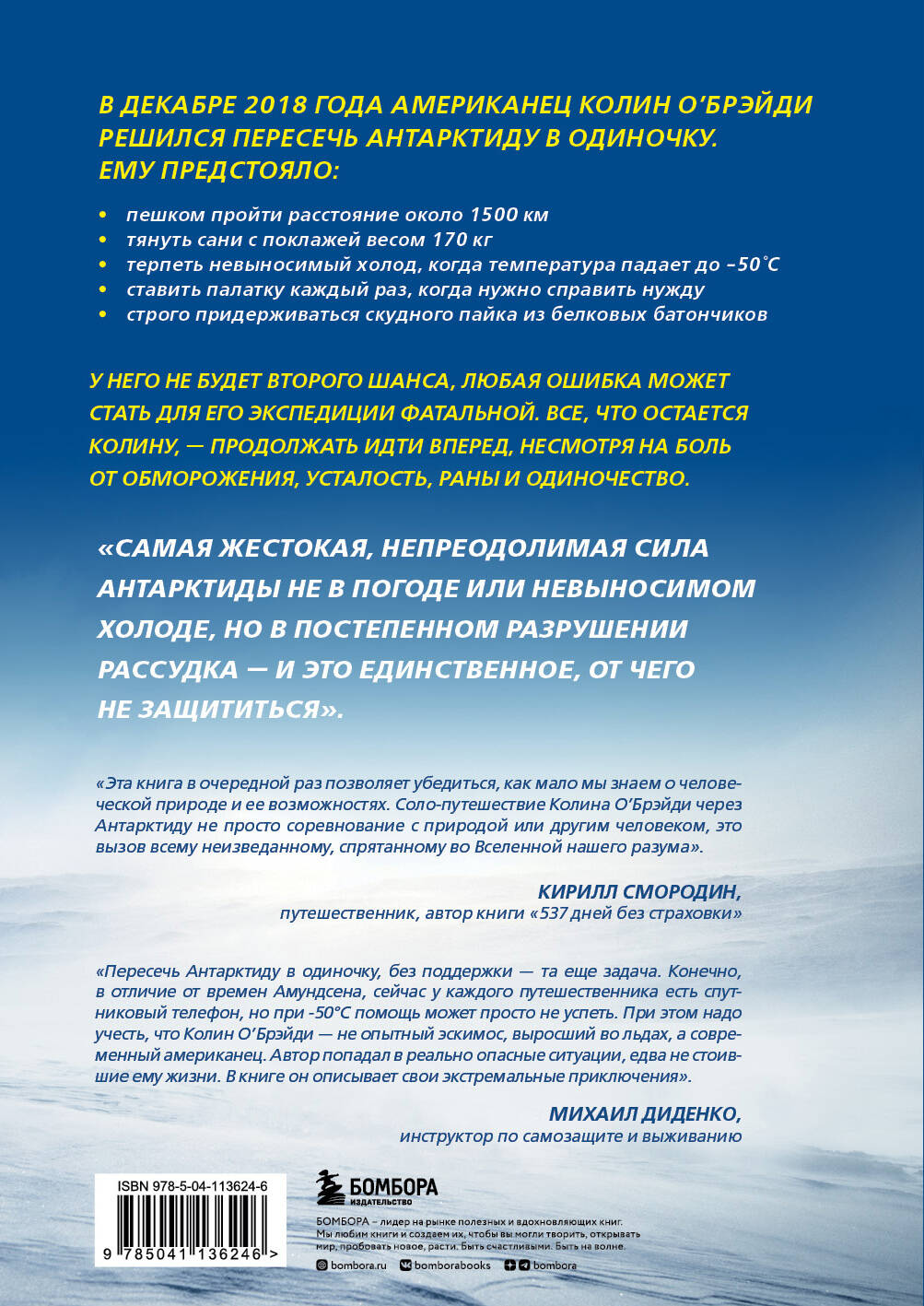 В декабре 2018 года американец Колин О'Брэйди решился пересечь Антарктиду в одиночку. Ему предстояло: - Пешком пройти расстояние около 1500 км. - Тянуть сани с поклажей весом 170 кг. - Строго придерживаться скудного пайка из белковых батончиков. Любой срыв может закончить его путешествие досрочно. - Ставить палатку каждый раз, когда нужно справить нужду. - Терпеть невыносимый холод, когда температура падает до -50° C. «Cамая жестокая, непреодолимая сила Антарктиды не в погоде или невыносимом холоде, но в неявном разрушении рассудка - и это единственное, от чего не защититься». (c) У него не будет второго шанса, любая ошибка может стать для его экспедиции фатальной. Все, что остается Колину - продолжать идти вперед, несмотря на боль от обморожения, усталость, падения и раны. ОТЗЫВЫ: «Пересечь Антарктиду в одиночку, без поддержки - та еще задача. Конечно, в отличие от времен Амундсена, сейчас у каждого путешественника есть спутниковый телефон, но при -50° C помощь может просто не успеть. При этом надо учесть, что Колин О'Брэйди - не опытный эскимос, выросший во льдах, а современный американец. Автор попадал в реально опасные ситуации, едва не стоившие ему жизни. В книге он описывает свои экстремальные приключения». - Михаил Диденко, инструктор по самозащите и выживанию «Ищете историю из жизни, которая вдохновит вас до глубины души? Вы ее нашли. "ICE MAN" - захватывающее путешествие на все времена. Колин поможет вам увидеть, на что способен человек, и вдохновит вас и ваших близких!» - Джо де Сена, основатель и генеральный директор Spartan1 «История Колина и его рекордный поход через Антарктиду продолжительностью пятьдесят четыре дня показывают, что источником великих побед часто становятся личные трудности. Настоятельно советую читать эту книгу по утрам, чтобы вдохновиться и решиться на свой первый невозможный подвиг». - Хэл Элрод, автор книги «Магия утра» «Захватывает. Трогает. Поражает. Книга "ICE MAN" наглядно демонстрирует пределы возможностей человека, при этом раскрывая, насколько огромен внутренний потенциал каждого из нас. Колин показывает, что величие состоит не в жизненных достижениях, а в том, как вы идете к ним и кто находится рядом. Это не просто приключенческая история, это история об опыте человека». - Льюис Хаус, автор книги «Как стать легендой» «Чудовищные физические испытания, которые перенес Колин, и его духовный опыт, расширяющий сознание, излагаются в этой книге в духе эпического сказания, полного приключений и открытий». - Пол Саймон, лауреат премии «Грэмми» «Достижение Колина О'Брэйди - первый в мире одиночный переход через Антарктиду - победа, обладающая непреходящей важностью. И книга "ICE MAN", рассказанная им история о том, как все происходило, - классика приключений... Стиль Колина и его ранимость обязательно тронут каждого, кто возьмет в руки эту феноменальную книгу». - Арон Ралстон, автор книги «Между молотом и наковальней»| Издательство | ООО "Издательство "Эксмо" |