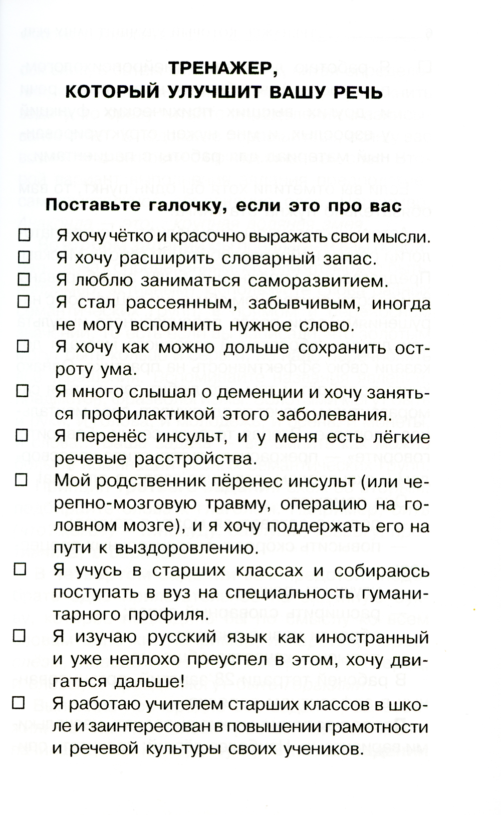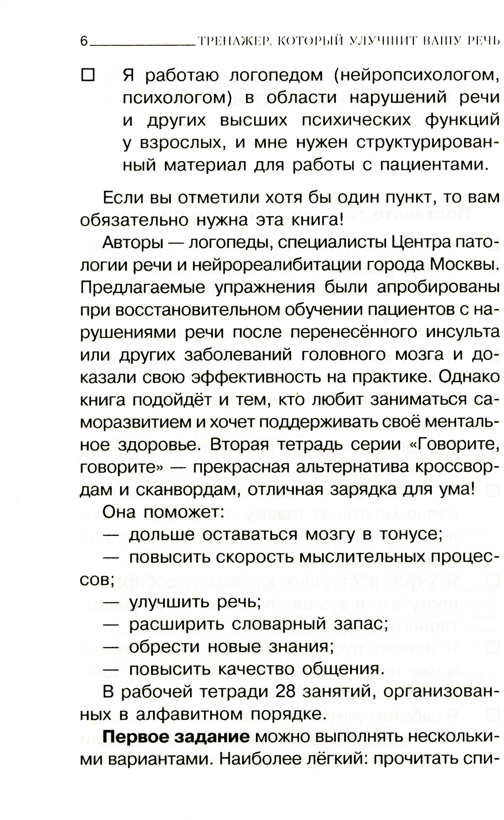 В комплект входят четыре книги серии «Говорите, говорите»: - «Ежедневник, который улучшит вашу речь» (поможет улучшать свою речь за 5-10 минут в день, практически не отрываясь от дел); - «Тренажер, который улучшит вашу речь» (задания для улучшения памяти, внимания и речи); - «Практикум, который улучшит вашу речь» (упражнения для улучшения дикции и произношения); - «Скороговорки, которые улучшат вашу речь» (слоговые цепочки, скороговорки и визуальные таблицы для работы над дикцией). Пособия адресованы самому широкому кругу людей: специалистам (логопедам, нейропсихологам) в работе с пациентами, тренерам по технике речи и публичным выступлениям, работникам телевидения и радио, театральным педагогам и студентам театральных вузов, а также всем, кто любит самосовершенствоваться или хочет сделать свою речь лучше.| Издательство | Омега-Л |