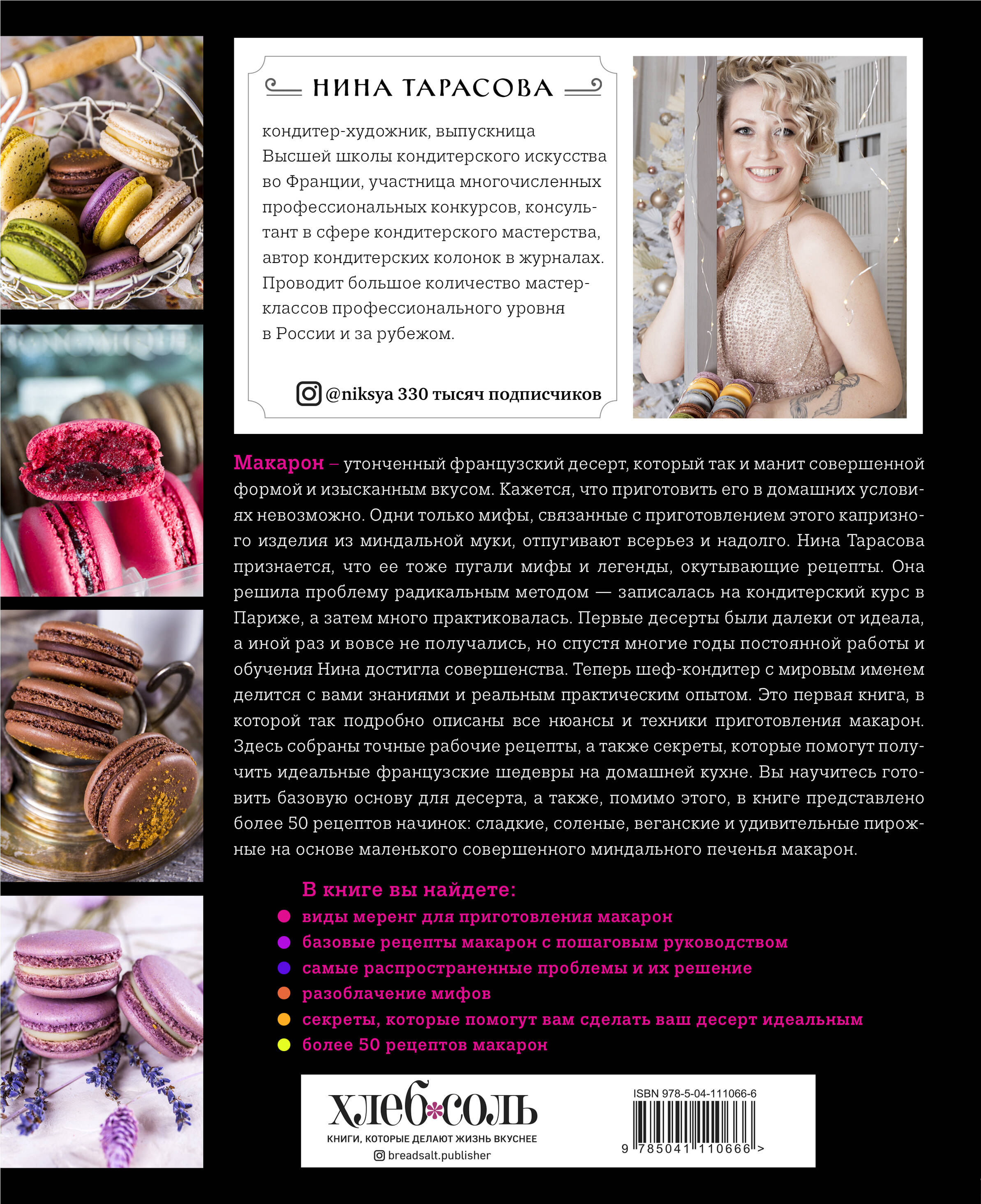 Нина Тарасова - кондитер-художник, консультант в сфере кондитерского мастерства, автор кондитерских колонок в журналах. Ежегодно повышает квалификацию в лучших европейских школах. Проводит большое количество мастер-классов профессионального уровня в России и за рубежом. Автор популярного кулинарного портала. В книге вы найдете: - виды меренг для приготовления макарон; - простые рецепты макарон с пошаговым руководством; - самые распространенные проблемы и их решение; - разоблачение мифов; - секреты, которые помогут сделать ваши макарон идеальными; - более 50 рецептов макарон: сладкие, несладкие, веганские и пирожные на основе макарон.