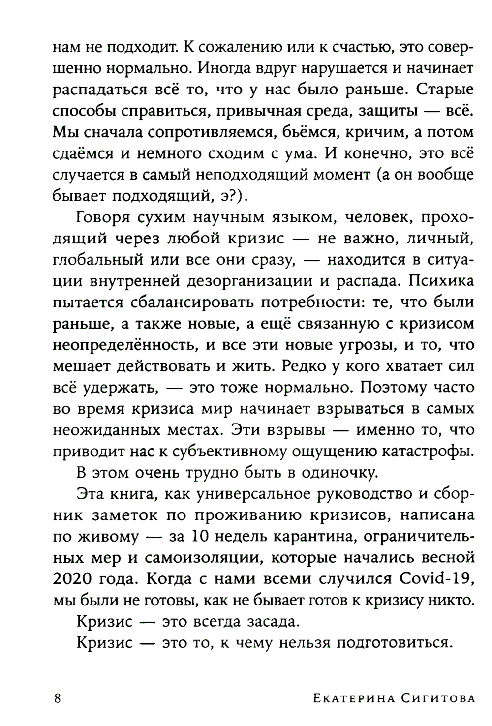 Кризис - это идеальный шторм: внутренние проблемы обостряются под влиянием внешних факторов и резонируют так, что необходимо их срочно решать. Книга психотерапевта Екатерины Сигитовой - маяк, с помощью которого вы сможете проложить собственный маршрут и пережить любой кризис, не важно, личный, глобальный или все сразу. В основу книги легли материалы вебинаров автора для тех, кто столкнулся с психологическими проблемами, вызванными пандемией. Здесь вы найдете комментарии и отклики людей, которые уже опробовали на себе предложенные Екатериной методики. «Идеальный шторм» - универсальное руководство по проживанию кризиса, а упражнения и задания из этой книги помогут вам переосмыслить пережитый опыт и использовать его для личного развития.| Издательство | Альпина Паблишер |