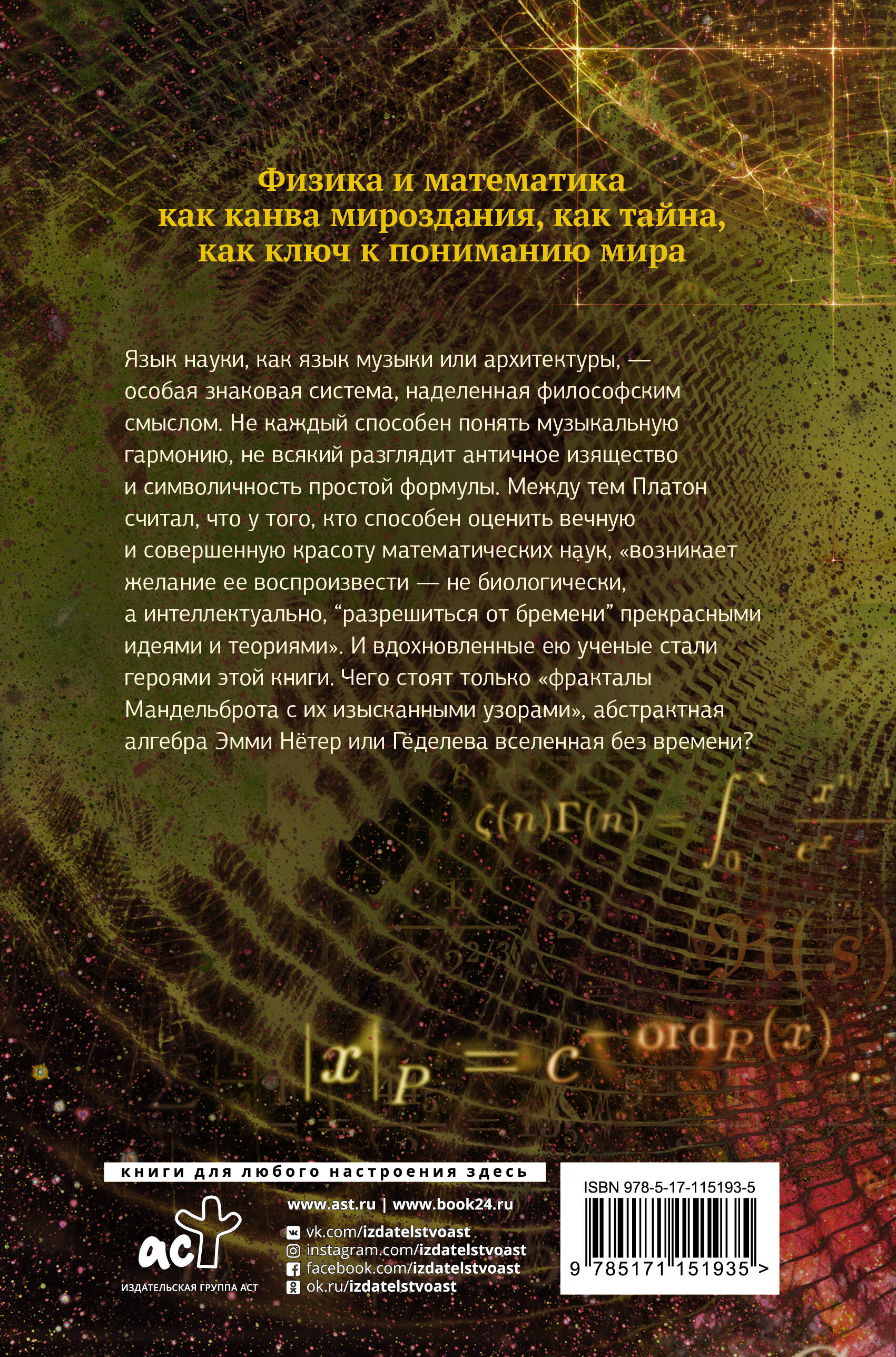 Язык науки, как язык музыки или архитектуры, - особая знаковая система, наделенная философским смыслом. Не каждый способен понять музыкальную гармонию, не всякий разглядит античное изящество и символичность простой формулы. Между тем Платон считал, что у того, кто способен оценить вечную и совершенную красоту математических наук, "возникает желание ее воспроизвести - не биологически, а интеллектуально, "разрешиться от бремени" прекрасными идеями и теориями". И вдохновленные ею ученые стали героями этой книги. Чего стоят только "фракталы Мандельброта с их изысканными узорами", абстрактная алгебра Эмми Нётер или Гёделева вселенная без времени.| Издательство | ИЗДАТЕЛЬСТВО "АСТ" |