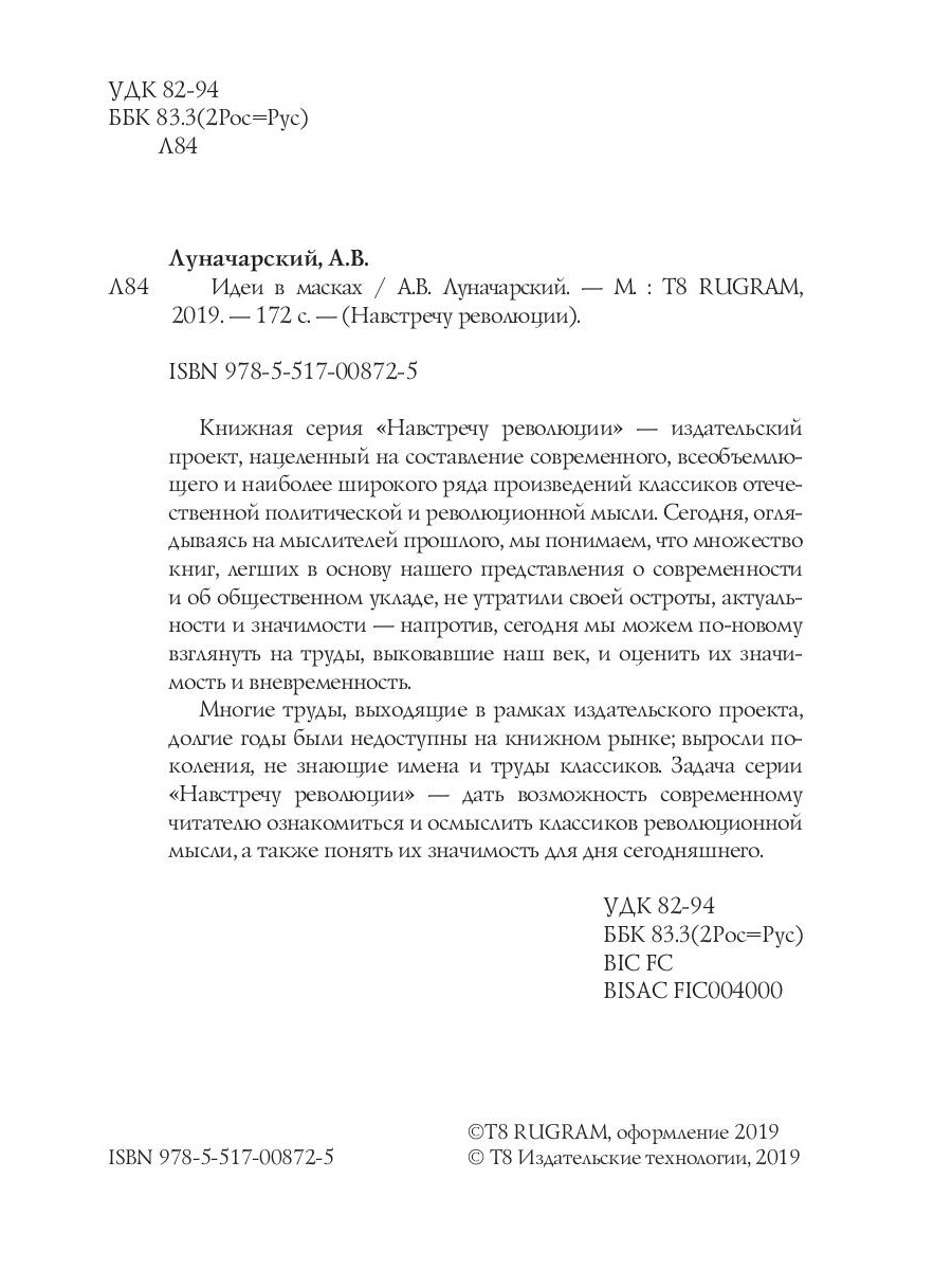 Книжная серия «Навстречу революции» - издательский проект, нацеленный на составление современного, всеобъемлющего и наиболее широкого ряда произведений классиков отечественной политической и революционной мысли. Сегодня, оглядываясь на мыслителей прошлого, мы понимаем, что множество книг, легших в основу нашего представления о современности и об общественном укладе, не утратили своей остроты, актуальности и значимости - напротив, сегодня мы можем по-новому взглянуть на труды, выковавшие наш век, и оценить их значимость и вневременность. Многие труды, выходящие в рамках издательского проекта, долгие годы были недоступны на книжном рынке; выросли поколения, не знающие имена и труды классиков. Задача серии «Навстречу революции» - дать возможность современному читателю ознакомиться и осмыслить классиков революционной мысли, а также понять их значимость для дня сегодняшнего.| Издательство | Т8 RUGRAM |