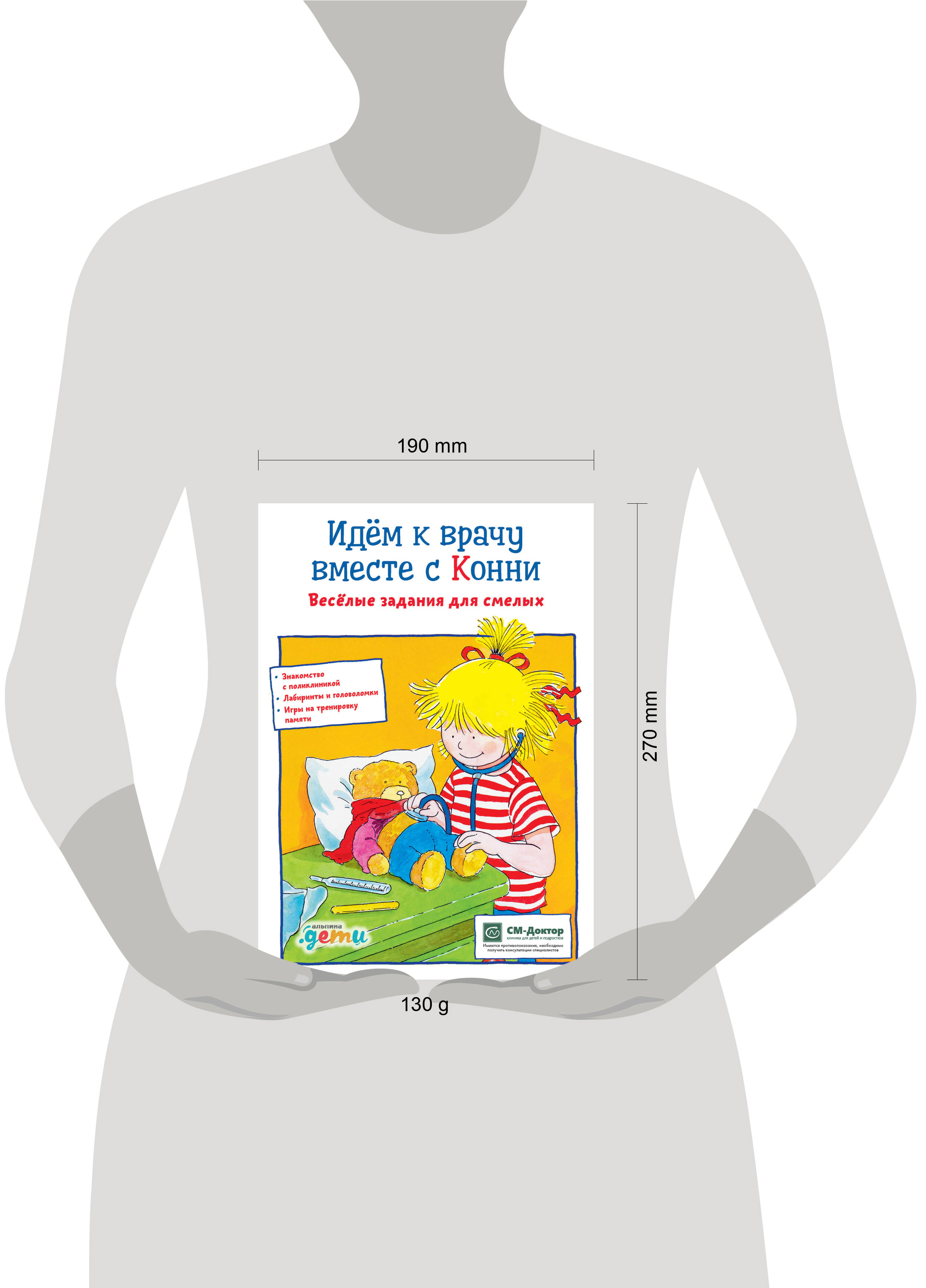 Книги с заданиями из серии "Лучший друг - Конни" в игровой форме знакомят детей с окружающим миром, помогают развивать мелкую моторику, тренировать письмо, счет, чтение и приобретать полезные навыки. Вместе с Конни вы легко и просто подготовите ребёнка к визиту в поликлинику. А весёлые задания и игры помогут успокоиться самым подозрительным и мнительным детям. Внутри вы найдёте информацию о том, как проходит приём и осмотр у врача, интересные лабиринты, раскраски и головоломки, игру для тренировки памяти, чек-лист для чистки зубов и заготовку коробочки для молочных зубов. Будьте здоровыми и храбрыми, как любимая героиня! • Поможет подготовить ребенка к осмотру у врача • Весёлые задания на развитие внимательности и логики • Чек-лист чистки зубов и игра-мемори Для кого Для детей от 4 лет. Отзывы Как сделать так, чтобы маленький пациент не боялся и не плакал при посещении врача? Прежде всего нужно создать правильный настрой. Эта занимательная книга поможет малышу обыграть свой страх. Вместе с девочкой Конни он отправится на осмотр к доктору, узнает, чем занимается медсестра, как надо чистить зубы, что такое стетоскоп и многое другое. Выяснив заранее, что ждёт его за дверью кабинета, ребёнок уже не будет бояться. Ведь поход в поликлинику - это повод узнать что-то новое и интересное. Ну а мы, врачи, постараемся оправдать его ожидания и сделать так, чтобы от этих визитов у малыша оставались только положительные впечатления. Ольга Сергеевна Родионова, главный врач СМ-Клиника в 3-м проезде Марьиной Рощи| Издательство | Альпина Паблишер ООО |