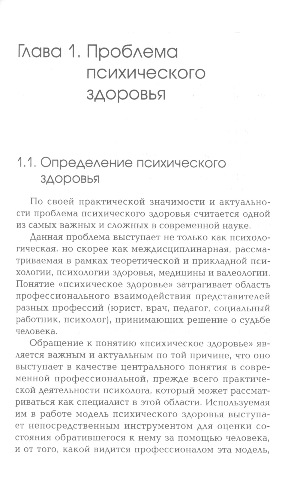 В монографии осуществлен сравнительный анализ понятий психического и психологического здоровья и описаны диагностические признаки психологического здоровья. В качестве интегративного критерия психологического здоровья предлагается феномен идентичности - динамическое, системное образование сознания, представленное в переживаниях человеком своего Я. В теоретической части монографии содержательно представлен феномен идентичности и описаны его структурные компоненты (Я-концепция и концепция Другого) и их динамические характеристики (дифференцированность-диффузность, целостность-расщепленность, статичность-динамичность).