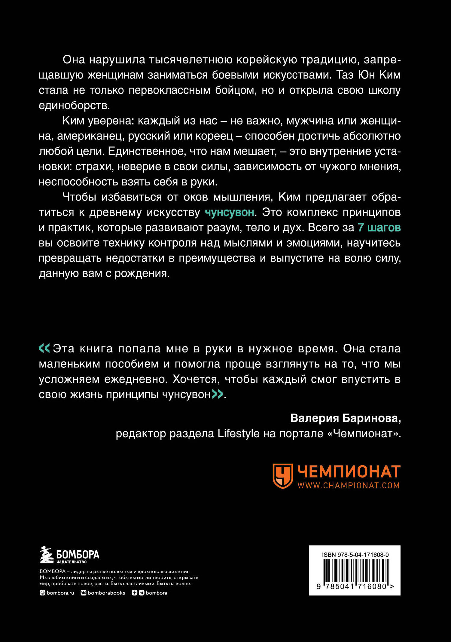 Когда разум захламлён суетой, тревогой и плохими мыслями - наша энергия рассеивается. Это происходит снова и снова, и мы становимся слабыми и неэффективными. Более того, в такой ситуации мы не можем быть честными с собой. Цель искусства Чунсувон - дать практические инструменты, благодаря которым вы сможете освободиться от ограничивающих, пагубных состояний ума, взглянуть на себя с разных сторон и пробудить свой невероятный потенциал к созданию жизни. Цитаты «ХРАНИ ВЕРНОСТЬ СВОИМ ЦЕЛЯМ, ОСОБЕННО КОГДА ВСЕ КАЖЕТСЯ БЕЗНАДЕЖНЫМ». «МЫ МОЖЕМ МНОГОМУ НАУЧИТЬСЯ У ПРИРОДЫ, ВНИМАТЕЛЬНО НАБЛЮДАЯ ЗА ЕЕ КРАСОТОЙ И СИЛОЙ». «НАМ ТАК ЧАСТО ХОЧЕТСЯ СДАТЬСЯ ВСЕГО В ОДНОМ ШАГЕ ДО УСПЕХА. НО ЕСЛИ УПОРНО И НАСТОЙЧИВО ТРУДИТЬСЯ, ДВЕРИ ОТКРОЮТСЯ». «НАСТОЯЩИЙ ПУТЬ ВОИНА - ГОРАЗДО БОЛЬШЕ, ЧЕМ ПОБЕДА НА СОРЕВНОВАНИИ». «ЕСЛИ БУДЕШЬ СРАВНИВАТЬ СЕБЯ С ДРУГИМИ, ТЫ УПУСТИШЬ ВОЗМОЖНОСТЬ НАЙТИ И РАЗВИТЬ СВОИ ЛУЧШИЕ КАЧЕСТВА И СИЛЬНЫЕ СТОРОНЫ». Об авторе Доктор Тэюн Ким - великий мастер боевых искусств, писательница и мотивационный спикер. Она начала тренироваться в возрасте семи лет, нарушив тысячелетнюю традицию, запрещавшую девочкам в Южной Корее изучать боевые искусства. Несмотря ни на что, Тэюн Ким стала первым мастером боевых искусств в Корее и одной из величайших мастеров боевых искусств в мире. В качестве главного тренера она привела первую в истории американскую женскую команду по тхэквондо к золотой медали на международных играх в Сеуле и помогла проложить путь женщинам на соревнования по боевым искусствам в рамках Олимпийских игр. Доктор Ким основала собственную школу боевых искусств, нацеленную на преодоление препятствий во всех сферах жизни. Преподает в своей академии в заливе Сан-Франциско. Также основала и возглавила ведущую технологическую компанию в Кремниевой долине и получила множество наград за выдающиеся достижения в гуманитарной сфере. Отзыв «Эта книга попала мне в руки в нужное время. Она стала маленьким пособием, как проще взглянуть на то, что мы усложняем ежедневно. Хочется, чтобы каждый смог впустить в свою жизнь принципы Чунсувон». - Валерия Баринова, редактор раздела Lifestyle на портале «Чемпионат»| Издательство | ООО "Издательство "Эксмо" |