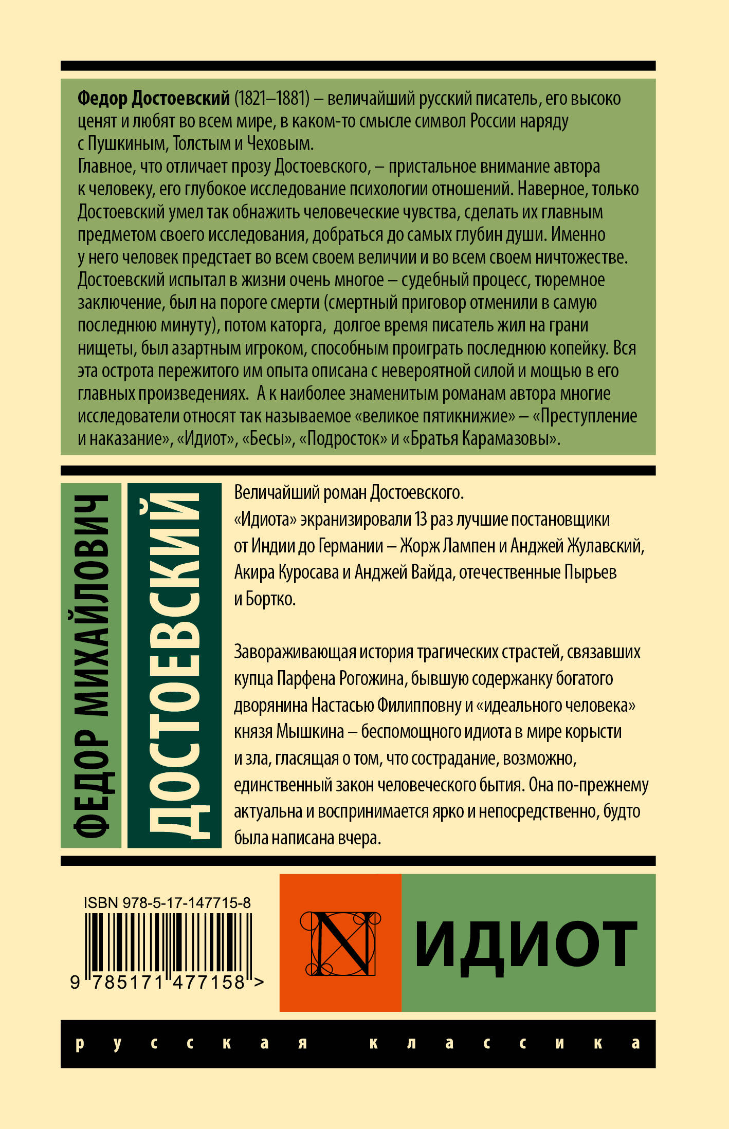 Величайший роман Достоевского. "Идиота" экранизировали 13 раз лучшие постановщики от Индии до Германии - Жорж Лампен и Анджей Жулавский, Акира Куросава и Анджей Вайда, отечественные Пырьев и Бортко. Завораживающая история трагических страстей, связавших купца Парфена Рогожина, бывшую содержанку богатого дворянина Настасью Филипповну и "идеального человека" князя Мышкина - беспомощного идиота в мире корысти и зла, гласящая о том, что сострадание, возможно, единственный закон человеческого бытия. Она по-прежнему актуальна и воспринимается ярко и непосредственно, будто была написана вчера.| Издательство | АСТ |