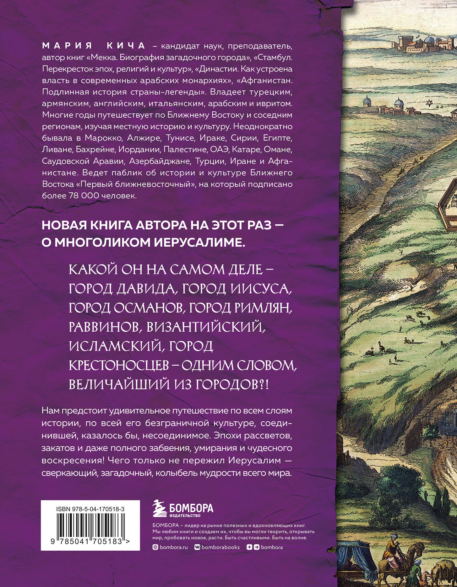 Сакральный перекресток культур и религий, город, в котором переплелись судьбы всего мира. «Ни один другой город не повлиял на судьбу человечества так сильно и глубоко, как Иерусалим», - говорит Мария Кича. Книга о том, какой он на самом деле - город Давида, город Иисуса, город османов, город римлян, раввинов, византийский, исламский, город крестоносцев, - одним словом, величайший из городов?! Нам предстоит удивительное путешествие по всем слоям истории, по всей его безграничной культуре, соединившей, казалось бы, несоединимое. Эпохи рассветов, закатов и даже полного забвения, умирания и чудесного воскресения! Чего только не пережил Иерусалим - сверкающий, загадочный, колыбель мудрости всего мира. Мария Кича - автор книг «Мекка. Биография загадочного города», «Стамбул. Перекресток эпох, религий и культур», «Династии. Как устроена власть в современных арабских монархиях», «Афганистан. Подлинная история страны-легенды». Владеет турецким, армянским, английским, итальянским, арабским и ивритом. Многие годы путешествует по Ближнему Востоку и соседним регионам, изучая местную историю и культуру.| Издательство | ООО "Издательство "Эксмо" |