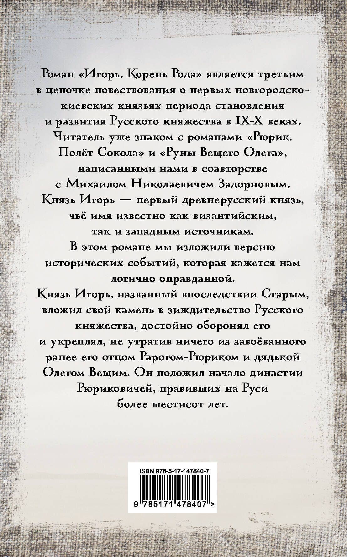 Роман "Игорь. Корень Рода" является третьим в цепочке повествования о первых новгородско-киевских князьях периода становления и развития Русского княжества в IX-X веках. Читатель уже знаком с романами "Рюрик. Полёт Сокола" и "Руны Вещего Олега", написанными нами в соавторстве с Михаилом Николаевичем Задорновым. Князь Игорь - первый древнерусский князь, чьё имя известно как византийским, так и западным источникам. В этом романе мы изложили версию исторических событий, которая кажется нам логично оправданной. Князь Игорь, названный впоследствии Старым, вложил свой камень в зиждительство Русского княжества, достойно оборонял его и укреплял, не утратив ничего из завоёванного ранее его отцом Рарогом-Рюриком и дядькой Олегом Вещим. Он положил начало династии Рюриковичей, правивших на Руси более шестисот лет.| Издательство | ИЗДАТЕЛЬСТВО "АСТ" |