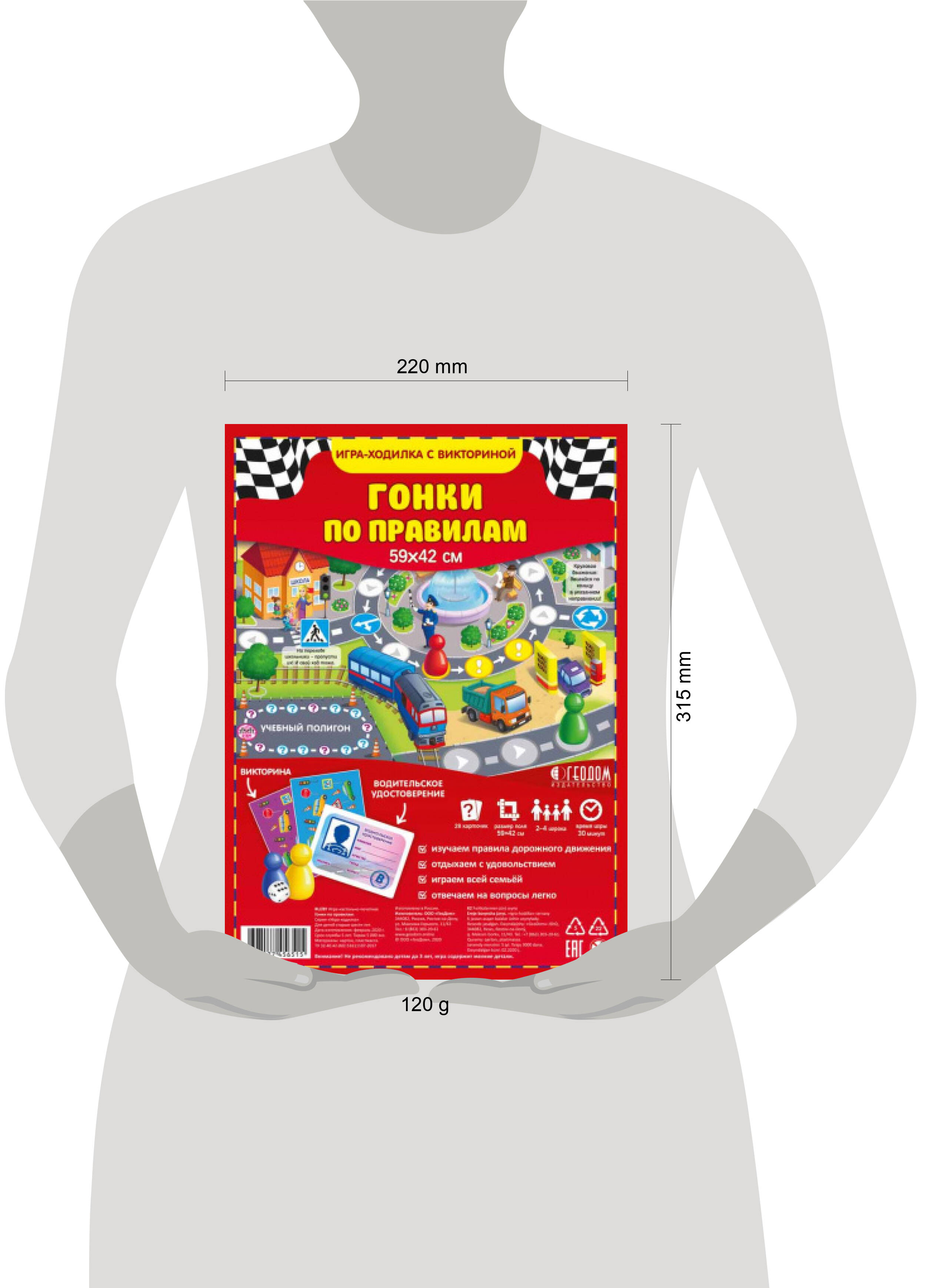 "Гонки по правилам" не просто настольная игра-ходилка - это настоящее приключение, в котором дети изучают правила дорожного движения. Для того, чтобы начать игру и выехать в город нужно сдать на права, а для этого игрокам предстоит ответить на несложные вопросы викторины. Только после этого участникам вручаются права и они могут выезжать в город. Игра рассчитана на детей от 6 лет, развивает внимание, тренирует память, ребенок учится считать, соблюдать правила, взаимодействовать с другими игроками, принимать победы или поражения. Игра "Гонки по правилам" - будет интересна не только мальчишкам, но и их папам, а это всегда источник положительных эмоций для всей семьи.| Издательство | ГеоДом ООО |