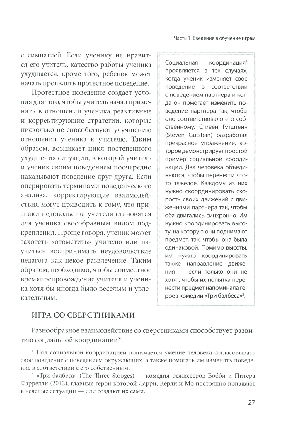 Игра - это не только естественная часть жизни большинства детей и любимый ими способ времяпрепровождения, это еще и неисчерпаемые возможности для их развития. Однако многие дети с РАС, в отличие от типично развивающихся детей, избегают игровых ситуаций и контактов со сверстниками. Кроме того, не только для родителей, но и для специалистов обучение детей с РАС игровой деятельности нередко представляет значительную сложность. Чтобы дети с аутизмом научились играть и получали удовольствие от игр, Стив Уорд, основываясь на методах прикладного анализа поведения, разработал универсальную методику обучения играм, о которой вы можете прочитать в этой книге. Данная методика включает теоретическое обоснование важности таких составляющих обучения играм детей РАС, как формирование у них мотивации и интереса к социальным взаимодействиям, специально разработанные автором процедуры обучения и способы измерения прогресса ребенка. В практической части книги С. Уорд на примере обширного игрового материала подробно рассказывает о том, зачем и как обучать той или иной игре, какие предшествующие навыки требуются ребенку, чтобы освоить игру, и как оценивать его достижения. Более тридцати наиболее распространенных во всем мире детских игр, в том числе прятки, перетягивание каната, настольные игры, судоку, «Горячо - холодно», «Испорченный телефон» и др., охватывают практически все аспекты игровой деятельности, создавая разнообразные возможности для вовлечения детей в игру. Работа с книгой поможет вам адаптировать под актуальные возможности вашего ребенка не только предлагаемые игры, но и любые другие.| Издательство | Рама Паблишинг |