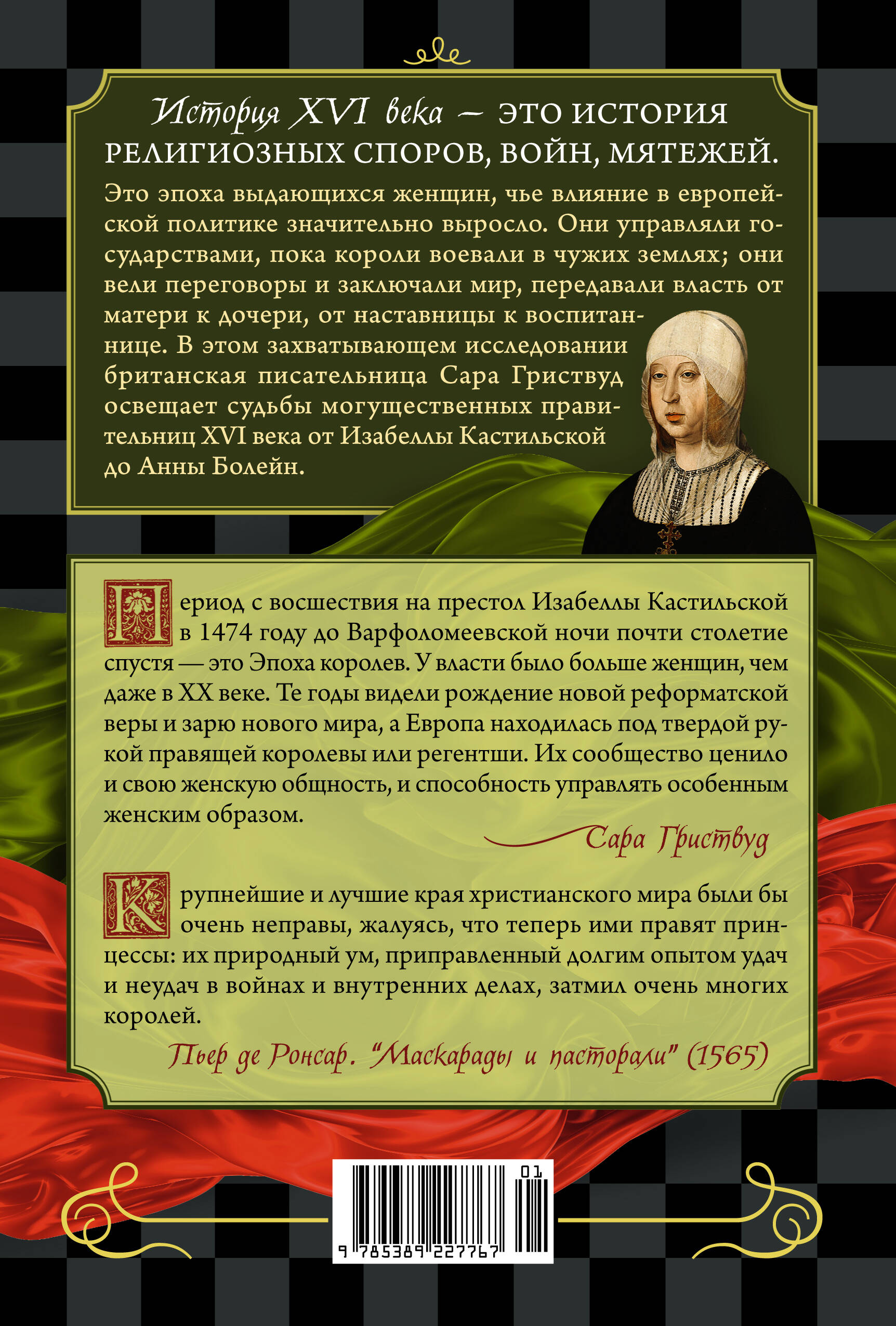 "Летом 1513 года при дворе Маргариты Австрийской появилась девочка - дочь придворного, обученная понимать опасный дворцовый танец. Она знала, что лучшей защитой для девушки служит ее ум, что благосостояние семьи может измениться по прихоти короля и что на европейской политической арене разыгрывается большая шахматная партия, в которой даже она может сыграть определенную роль. Никто, разумеется, не представлял, насколько значительной будет эта роль". (Сара Гриствуд) Анна Болейн и Маргарита Австрийская, при дворе которой она служила и воспитывалась. Луиза Савойская и ее дочь, одна из первых французских писательниц, Маргарита Наваррская. Кристина Датская и Екатерина Медичи, по слухам имевшая страсть к ядам. Это лишь некоторые из знаменитых женщин, которые участвовали в европейской политике XVI века, а зачастую и полностью ее направляли. Эти удивительные правительницы сознательно пользовались своим статусом, чтобы вести дела по-другому, признавали сестринские узы, оказывались пешками в чужой игре и пользовались другими людьми - в собственной. В шахматной партии европейской политики именно королева стала ключевой фигурой. История XVI века - это гамбит королев.| Издательство | Азбука-Аттикус Издат.группа ООО |