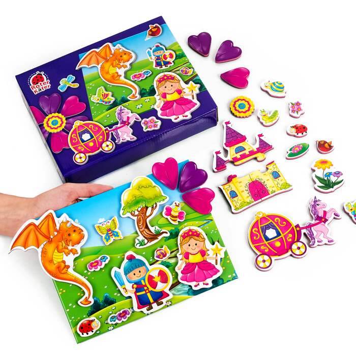 В некотором царстве, в некотором государстве, жили принцесса и доблестный рыцарь. Стены их замка возвышались над бескрайней цветочной поляной. А охранял их добрый и мудрый дракон! Хотите окунуться в прекрасную сказку вместе с нашими героями? Игровой набор "Принцесса и рыцарь" содержит магнитную доску, с изображенным на ней сюжетом, и 30 тематических магнитов. Прикрепляя их к доске, ребенок создаст свою неповторимую историю. Придумывайте новые события и делитесь ими друг с другом! Все магниты объемные, их удобно крепить и снимать. В процессе игры ребёнок потренирует воображение, фантазию, логическое мышление, речь и мелкую моторику. Создавайте сказку своими руками!| Издательство | Я РАСТУ ТОЙЗ ООО |