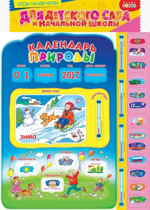 ''Календарь природы'' - не только приятный, но и полезный подарок! Он привлечет внимание ярким красочным оформлением и порадует вашего ребенка занимательными картинками. Наблюдая за погодой и ежедневно меняя карточки на календаре, ребенок научится различать времена года, правильно определять и называть числа, месяцы, дни недели, природные явления и состояния.