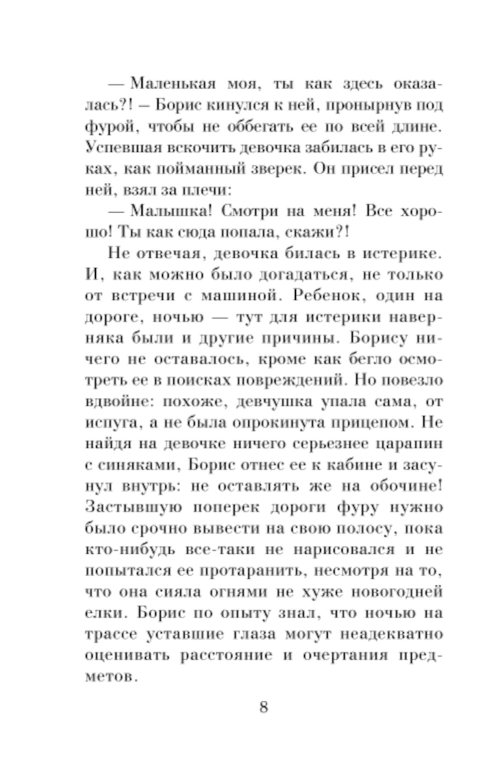 Борис возвращался домой из рейса, когда под колеса его фуры бросилась маленькая девочка. Трагедии удалось избежать только чудом! Малышка не получила травм, но была сильно испугана, причем отнюдь не происшествием на дороге. Она не смогла толком объяснить, что же с ней случилось и как оказалась одна в ночном лесу, но Борис понял из ее рассказа, что дома произошло что-то страшное и девочку кто-то преследует. Кажется, только он может быть ее надеждой на спасение...| Издательство | Эксмо |