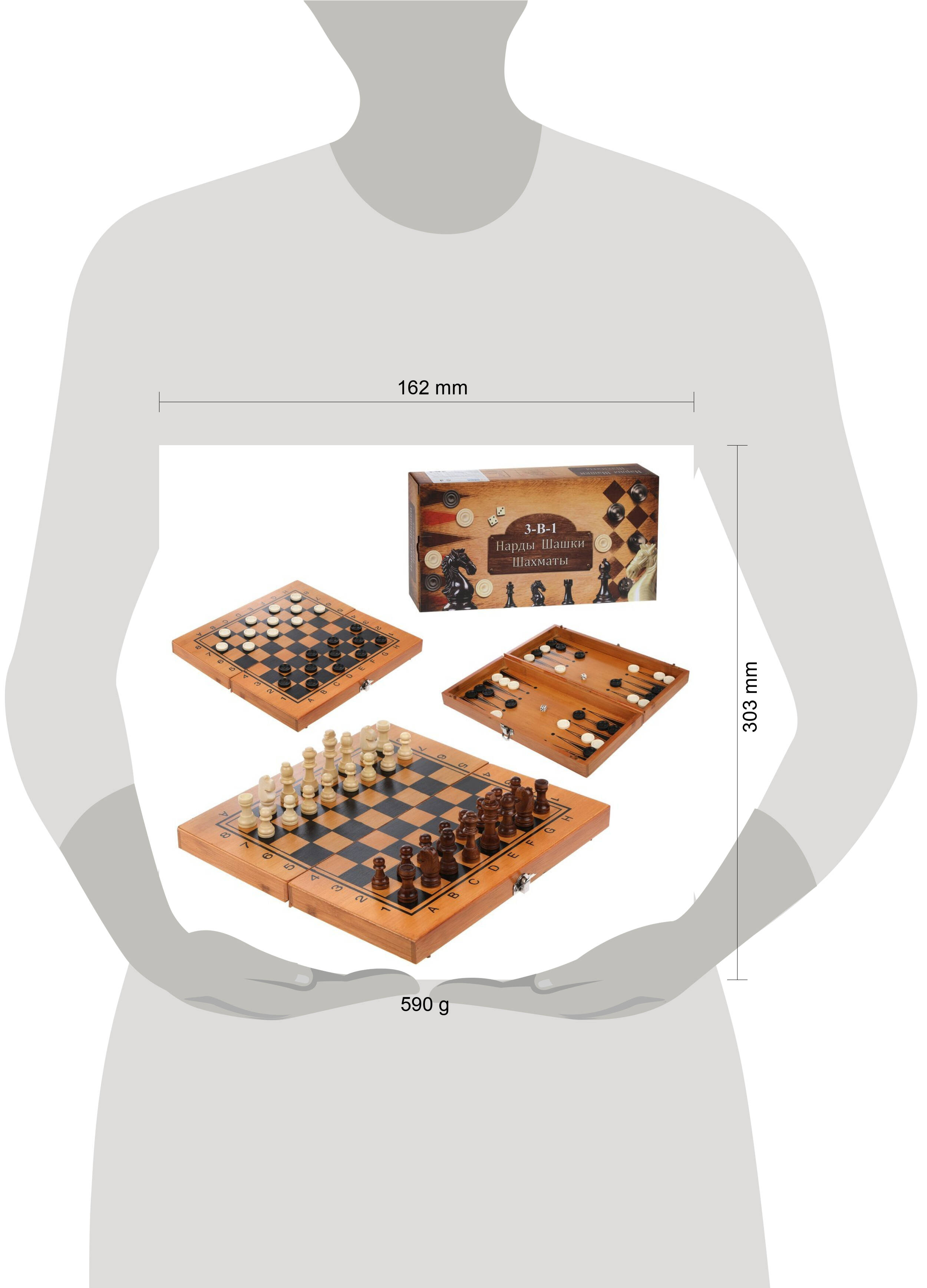 Увлекательная настольная игра 3 в 1: шашки, нарды и шахматы. Эти традиционные стратегические игры интересны и маленьким, и взрослым. Они развивают память, логическое мышление и повышают интеллектуальные способности. Размер игрового поля (ДхШ) составляет 29х29 см. Материал изготовления: дерево. Рекомендованный возраст: 6 лет +| Издательство | Наша игрушка ТК ООО |