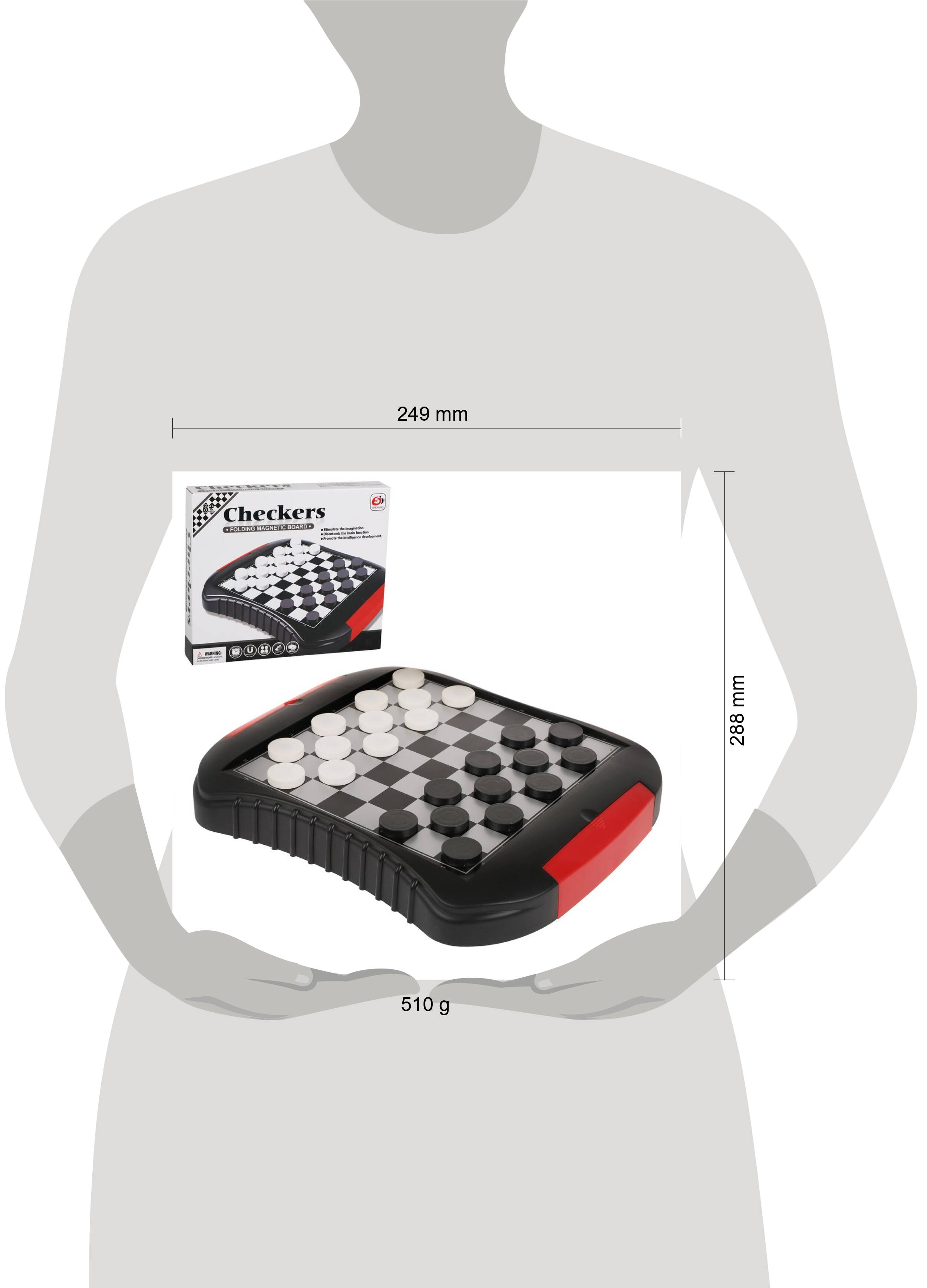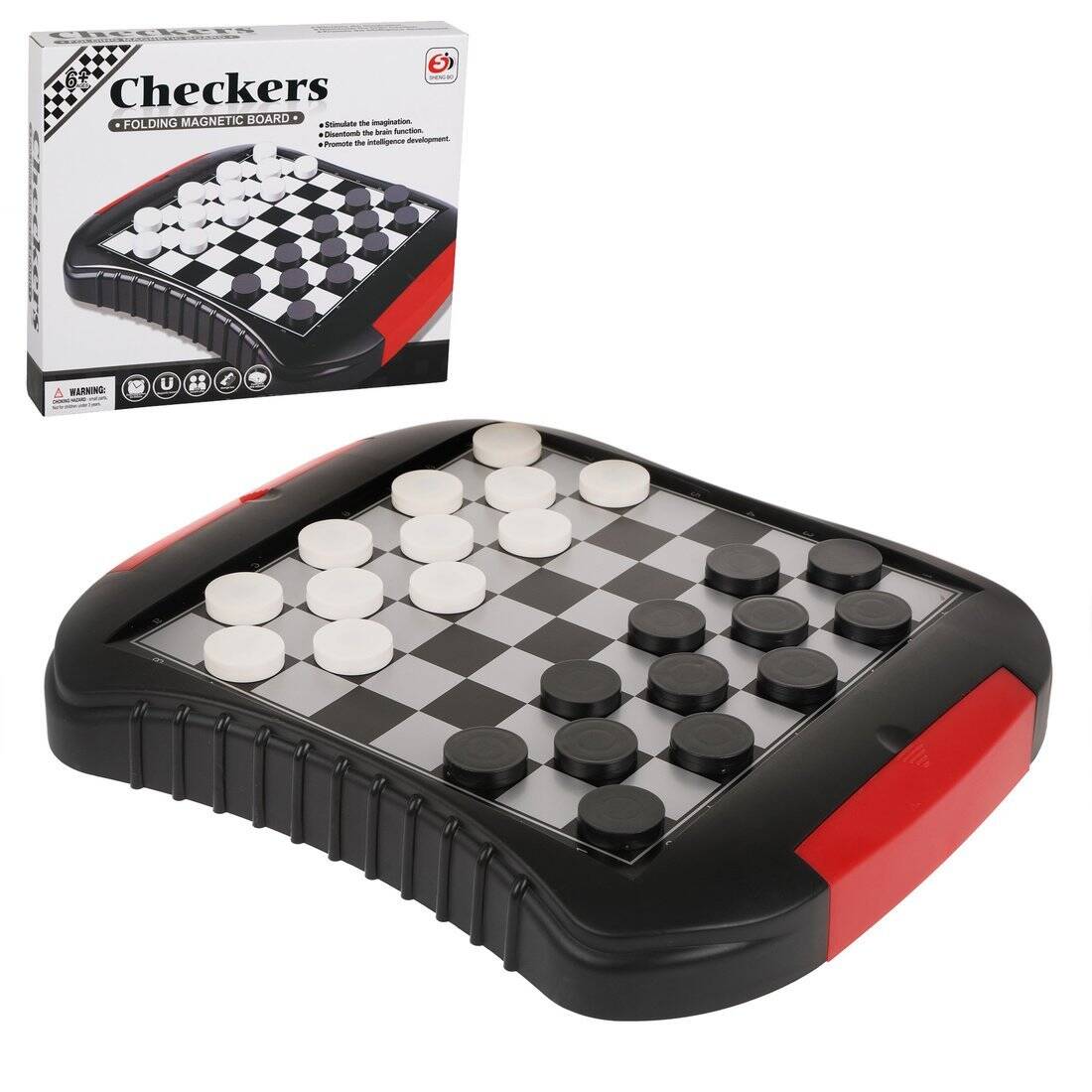 Шашки - это классическая настольная игра, которая способствует развитию внимания, памяти, логического и стратегического мышления. Игра происходит на магнитной доске, поделённой на равные квадратные клетки чёрного и белого цвета. Со стороны каждого игрока имеется выдвижной ящик для хранения фигур. Размер игрового поля (ДхШхВ) составляет 27,5х23,5х3 см. Материал изготовления: пластмасса. Рекомендованный возраст: 6 лет +