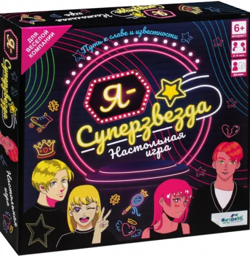 В наборе: поле, 4 планшета игроков, карточки Дел (50 шт.), карточки Событий (50 шт.), карточки Еды (12 шт.), 4 двусторонние карточки Суперзвезд разных цветов, игральный кубик, 12 фишек-маркеров, правила.