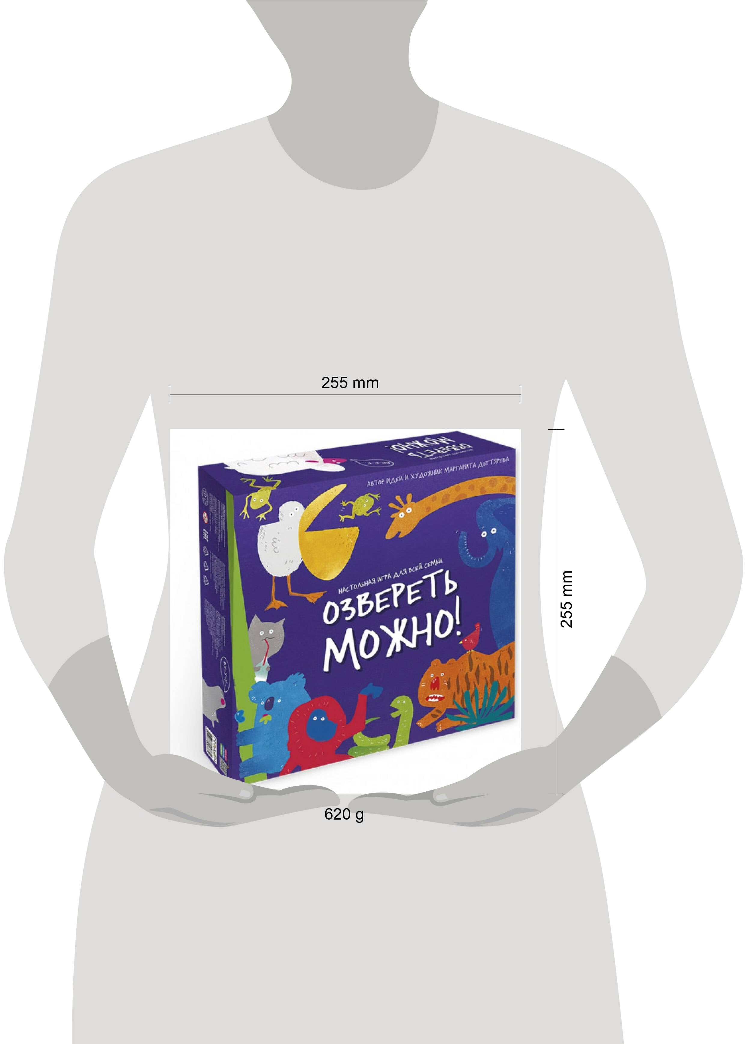 "Озвереть можно!" - это весёлая и интересная настольная игра для детей старше 5 лет и их родителей. Три в одном: активная игра с заданиями (покажи, произнеси, найди на поле, нарисуй в воздухе и др.), игра на скорость и первая стратегия для детей, в которой нужно собирать карточки. Все 3 механики рассчитаны на возраст и игровой опыт детей 5-8 лет. В игре есть весёлые стихи, смешные задания и минутка баловства: мяукать, рычать, ходить конём и трубить как слон - можно! Игра для всей семьи! В комплекте: - Поле игры с ламинированным покрытием 46,7х46,7 см; - 30 больших карточек с животными; - 30 маленьких карточек с животными; - 24 жетона скорости; - 6 двусторонних памяток; - 6 фишек-героев, кубик; - Правила игры.| Издательство | ГеоДом ООО |