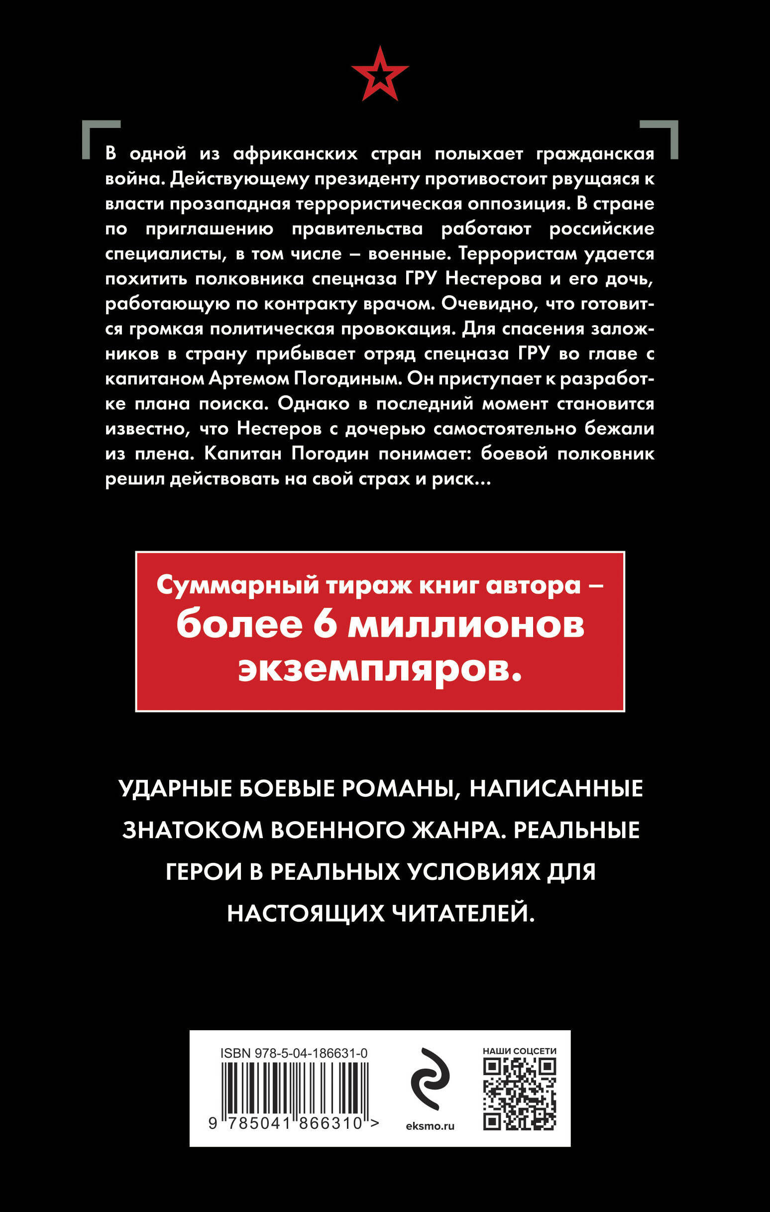 Ударные военные романы, написанные настоящим знатоком жанра. Суммарный тираж книг автора - более 6 миллионов экземпляров. В одной из африканских стран полыхает гражданская война. Действующему президенту противостоит рвущаяся к власти прозападная террористическая оппозиция. В стране по приглашению правительства работают российские специалисты, в том числе - военные. Террористам удается похитить полковника спецназа ГРУ Нестерова и его дочь, работающую по контракту врачом. Очевидно, что готовится громкая политическая провокация. Для спасения заложников в страну прибывает отряд спецназа ГРУ во главе с капитаном Артемом Погодиным. Он приступает к разработке плана поиска. Однако в последний момент становится известно, что Нестеров с дочерью самостоятельно бежали из плена. Капитан Погодин понимает: боевой полковник решил действовать на свой страх и риск… Реальные герои в реальных условиях для настоящих читателей. Горные перевалы, засады и жестокие схватки с бандитами - такова пропитанная порохом атмосфера этих захватывающих боевиков.