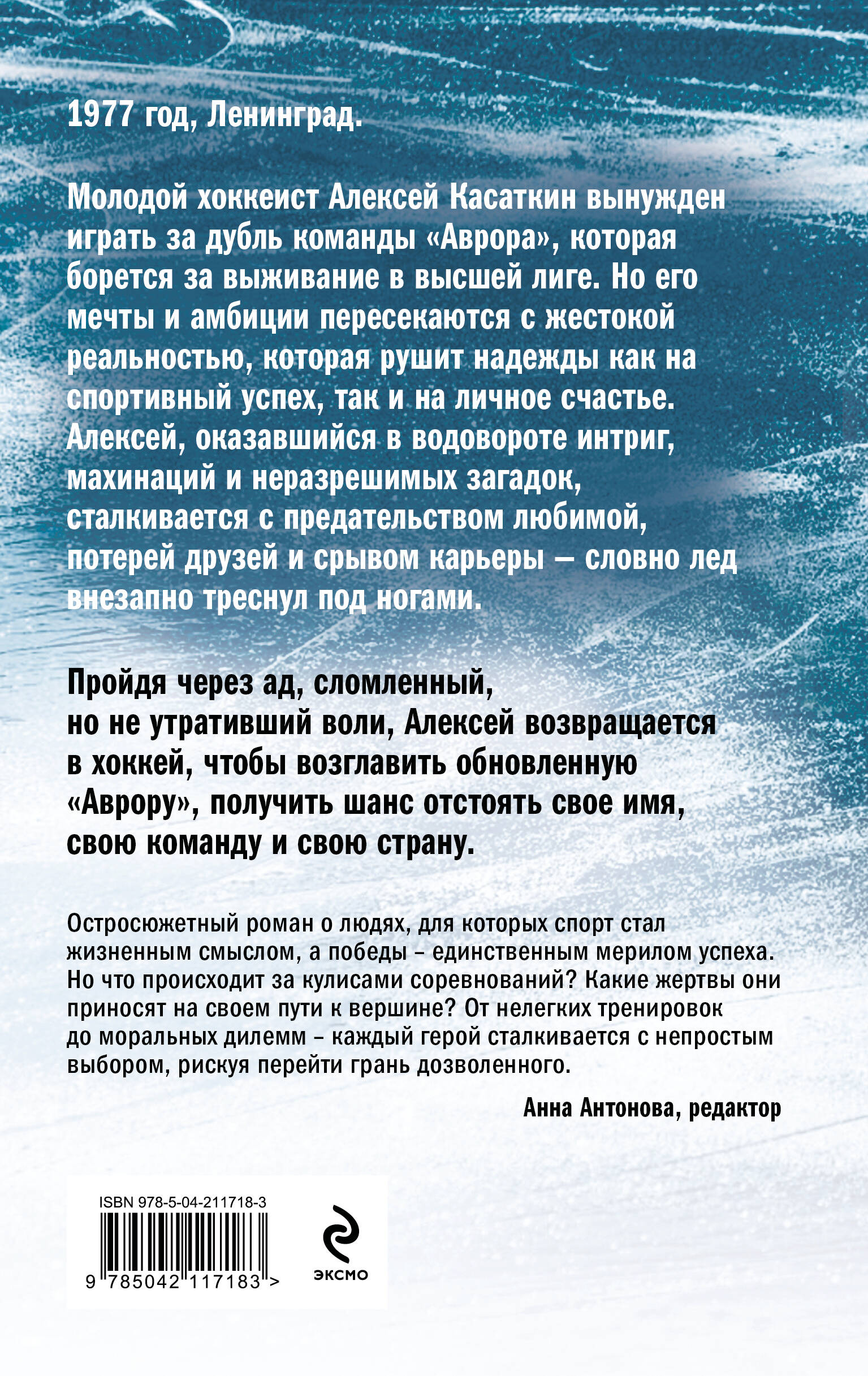 1977 год, Ленинград. Молодой хоккеист Алексей Касаткин вынужден играть за дубль команды «Аврора», которая борется за выживание в высшей лиге. Но его мечты и амбиции пересекаются с жестокой реальностью, которая рушит надежды как на спортивный успех, так и на личное счастье. Алексей, оказавшийся в водовороте интриг, махинаций и неразрешимых загадок, сталкивается с предательством любимой, потерей друзей и срывом карьеры - словно лед внезапно треснул под ногами. Пройдя через ад, сломленный, но не утративший воли Алексей возвращается в хоккей, чтобы возглавить обновлённую «Аврору», получить шанс отстоять своё имя, свою команду и свою страну. Книга, в которой переплетается спорт, любовь и детективная интрига, вызывает целый спектр эмоций - от грусти и гнева до надежды и вдохновения. Главному герою предстоит ответить на главный вопрос: насколько далеко может зайти человек, чтобы восстановить справедливость и вернуться к самому себе?