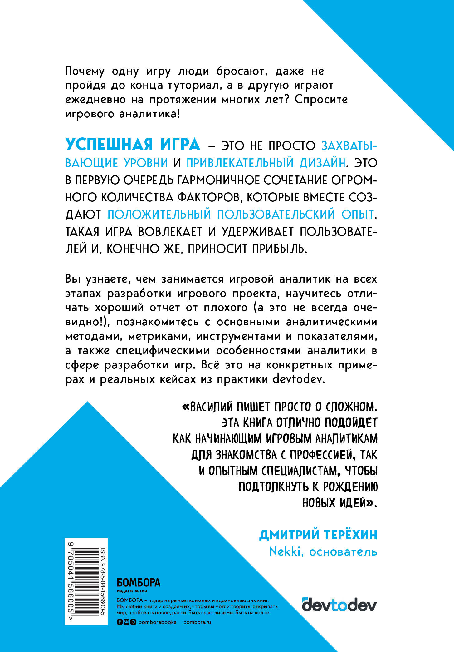 Успешная игра - это не просто захватывающие уровни и привлекательный дизайн. Это, в первую очередь, гармоничное сочетание огромного количества факторов, которые вместе создают положительный пользовательский опыт. Такая игра вовлекает и удерживает пользователей и, конечно же, приносит прибыль. Почему одну игру люди бросают, даже не пройдя до конца туториал, а в другую играют ежедневно на протяжении многих лет? Спросите игрового аналитика! Василий Сабиров, сооснователь аналитической платформы devtodev, знает, как сделать так, чтобы ваша игра чувствовала себя лучше. Вы узнаете, чем занимается игровой аналитик на всех этапах разработки игрового проекта, научитесь отличать хороший отчет от плохого (а это не всегда очевидно!), познакомитесь с основными аналитическими методами, метриками, инструментами и показателями, а также специфическими особенностями аналитики в сфере разработки игр. Всё это на конкретных примерах и реальных кейсах из практики devtodev.| Издательство | ООО "Издательство "Эксмо" |
