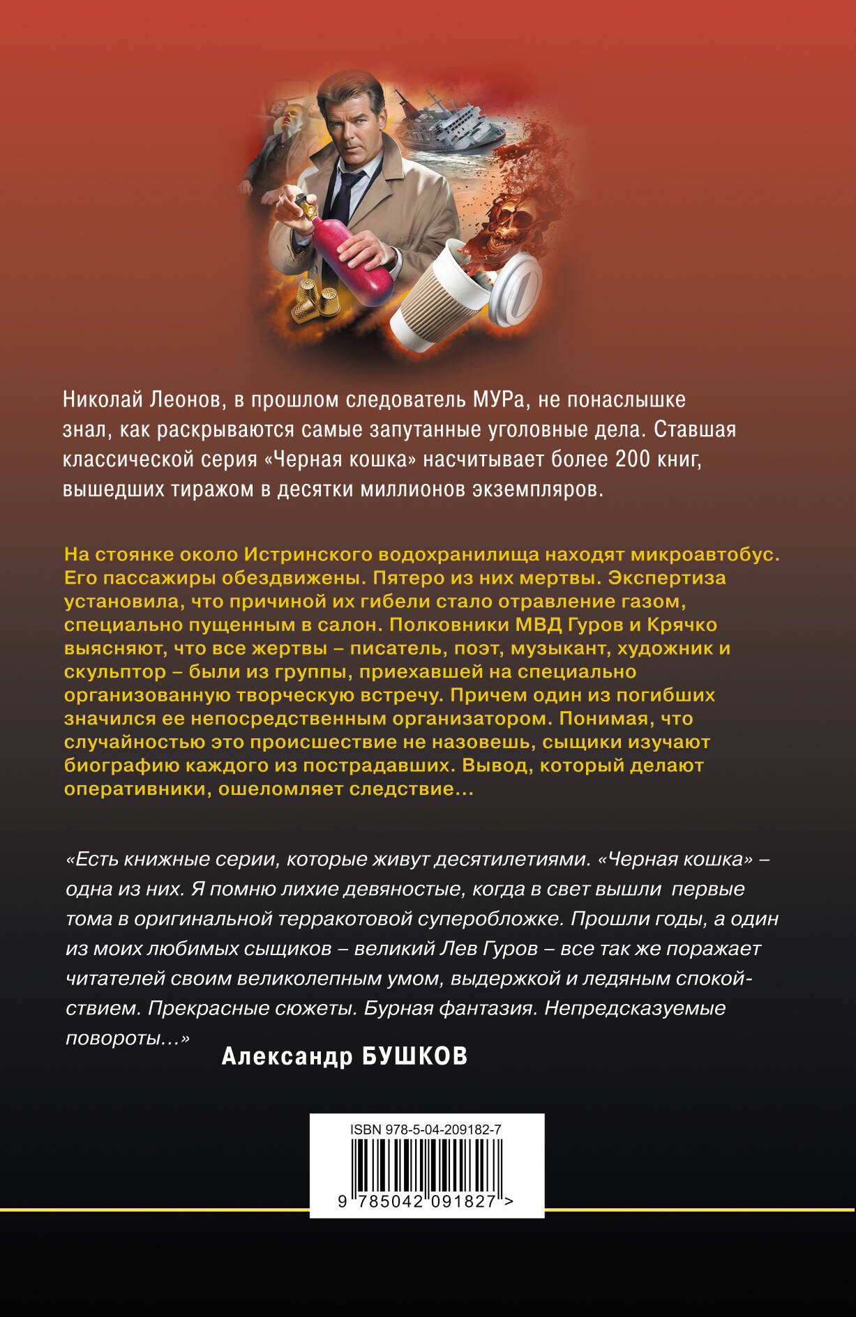 Легендарный детективный тандем Леонов - Макеев. На стоянке около Истринского водохранилища находят микроавтобус. Его пассажиры обездвижены. Пятеро из них мертвы. Экспертиза установила, что причиной их гибели стало отравление газом, специально пущенным в салон. Полковники МВД Гуров и Крячко выясняют, что все жертвы - писатель, поэт, музыкант, художник и скульптор - были из группы, приехавшей на специально организованную творческую встречу. Причем один из погибших значился ее непосредственным организатором. Понимая, что случайностью это происшествие не назовешь, сыщики изучают биографию каждого из пострадавших. Вывод, который делают оперативники, ошеломляет следствие… Николай Леонов, в прошлом следователь МУРа, не понаслышке знал, как раскрываются самые запутанные уголовные дела. Поэтому каждая его книга - это правдивая захватывающая история с непредсказуемой интригой и неожиданным финалом. Главный герой этих книг, полковник Лев Гуров - сыщик высокого класса, к тому же с массой положительных человеческих качеств. Его уважают друзья, боятся враги и любят женщины. Он - настоящий отечественный супермен. Романы о Льве Гурове вот уже сорок лет неизменно привлекают поклонников отечественного детектива. Ставшая классической серия «Черная кошка» насчитывает более 200 книг, вышедших тиражом в десятки миллионов экземпляров.| Издательство | ООО "Издательство "Эксмо" |